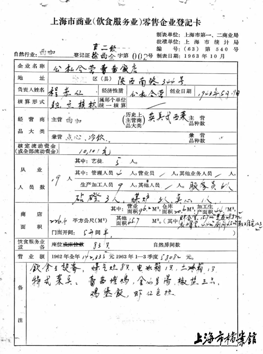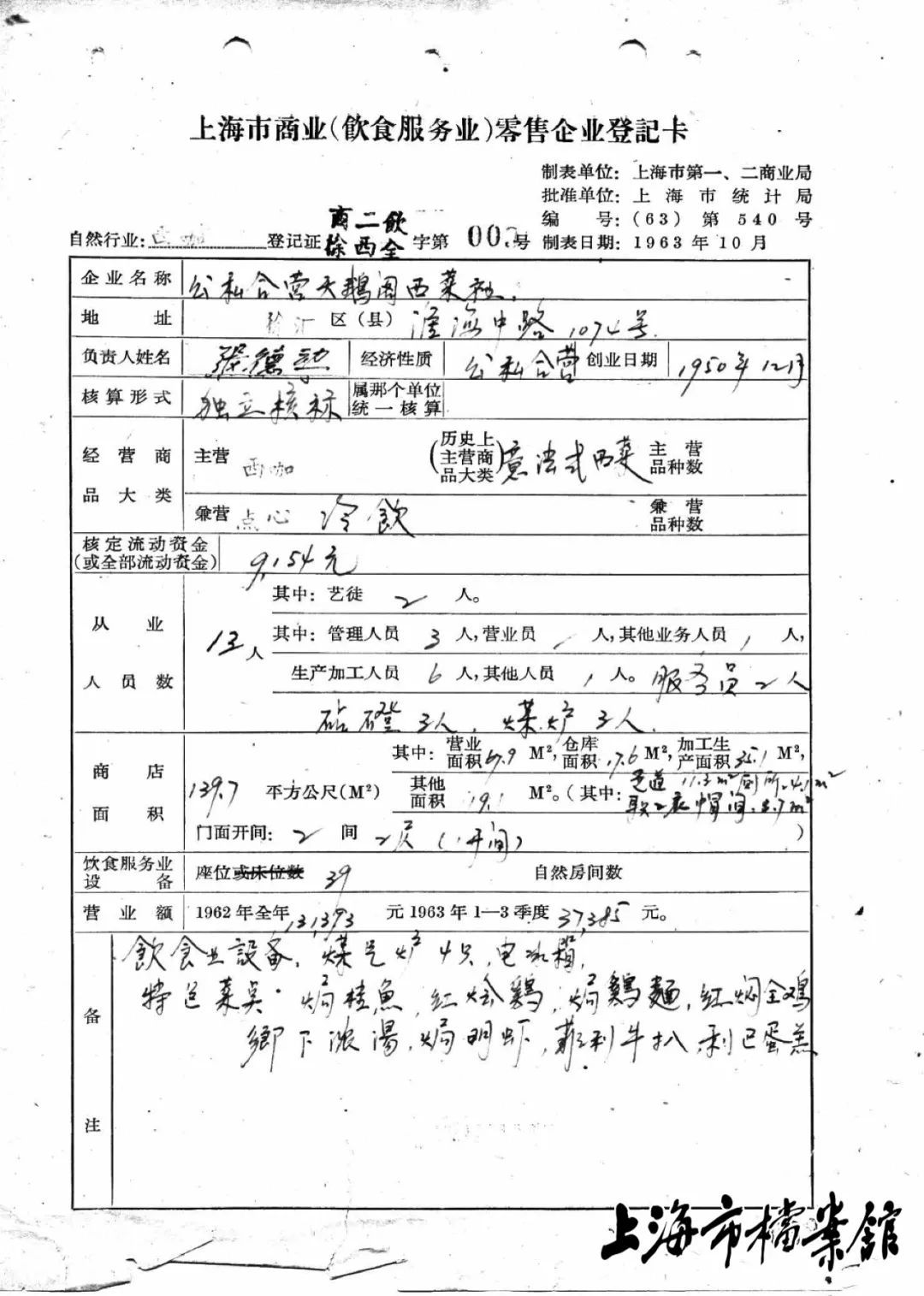 1963年,天鹅阁西菜社登记卡(上海市档案馆藏)