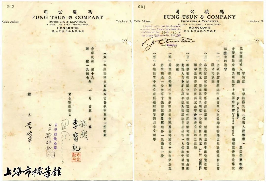1947年,安乐纺织公司购买汇中饭店继续经营的文书(上海市档案馆藏)