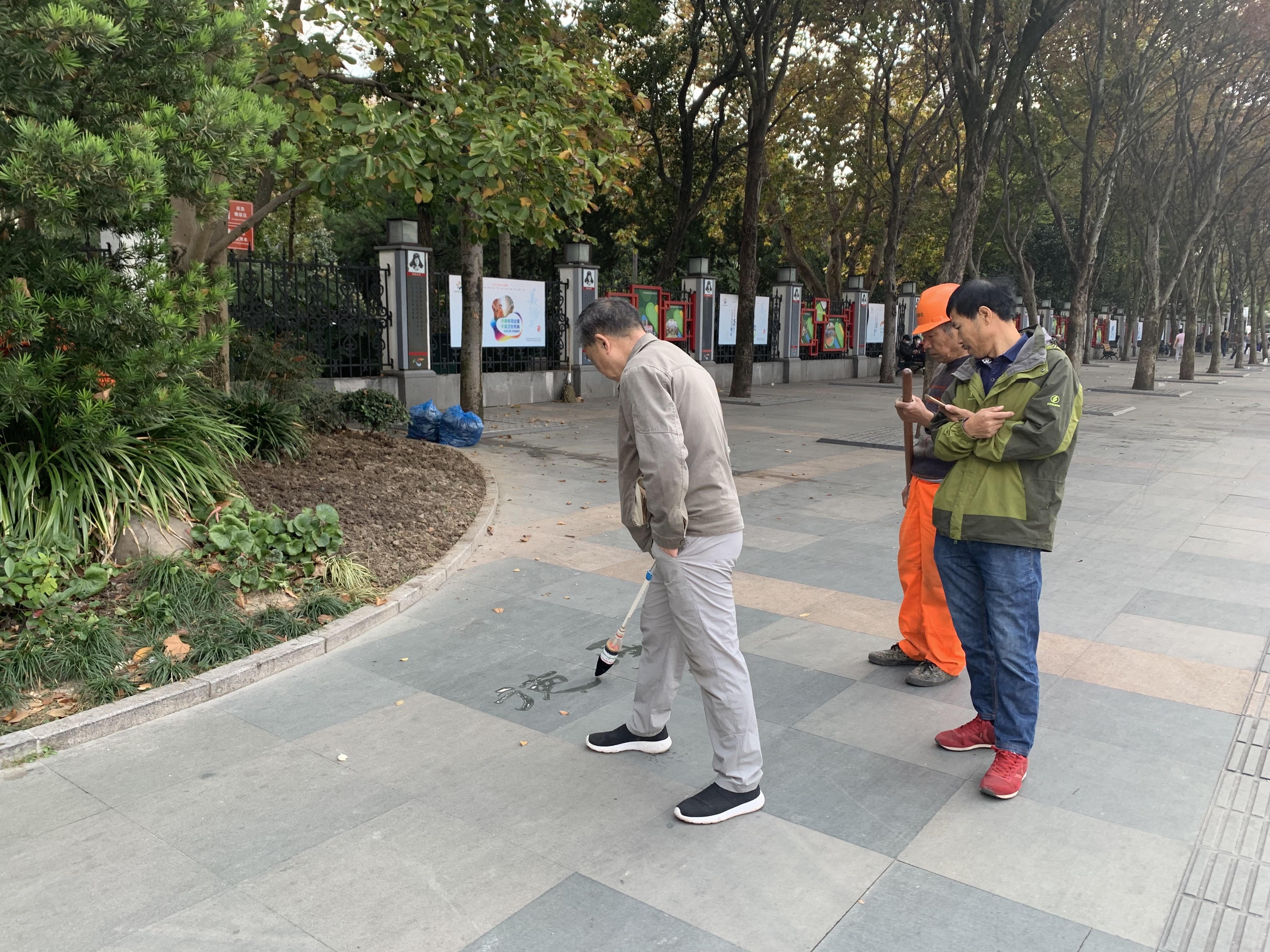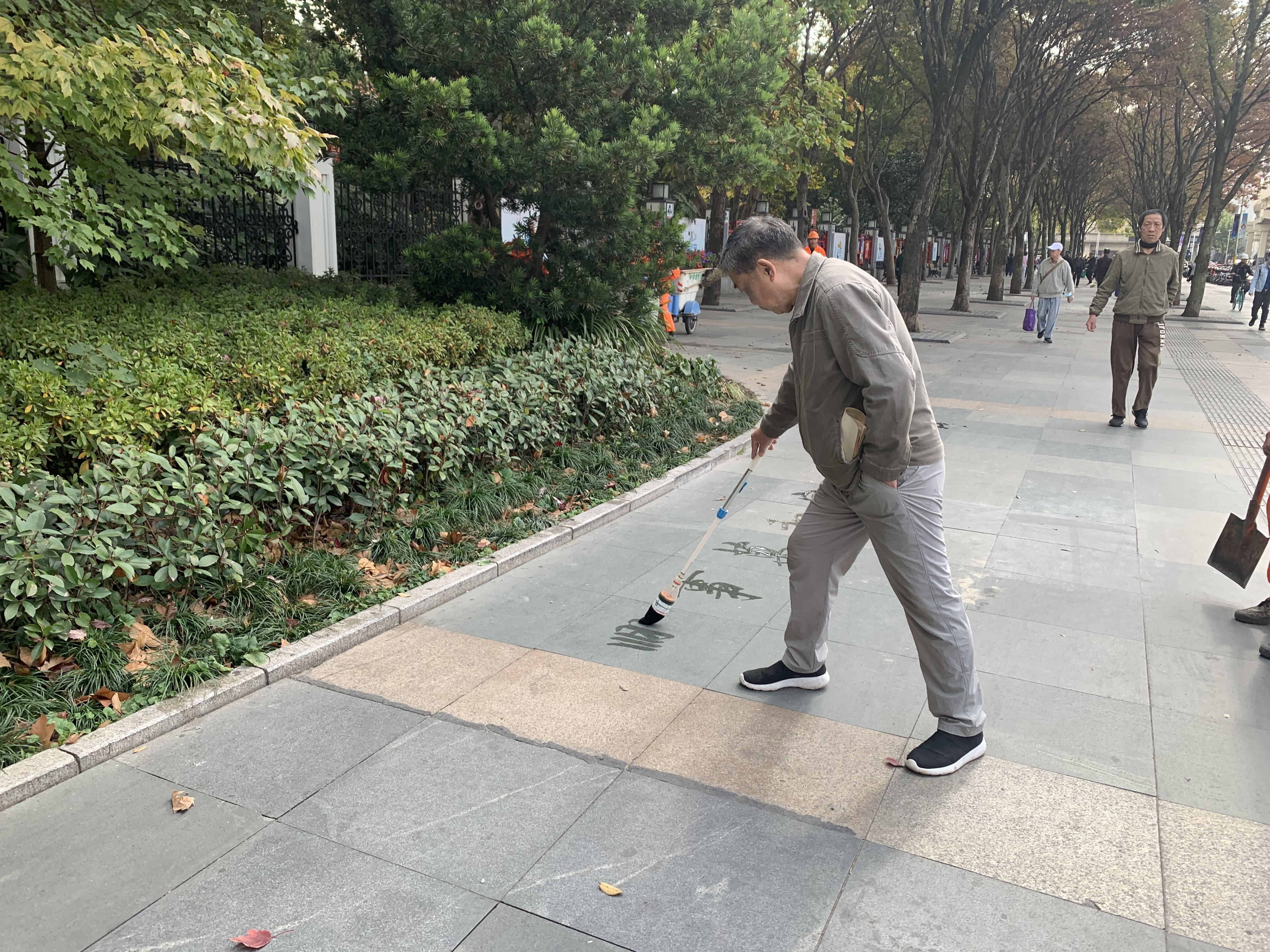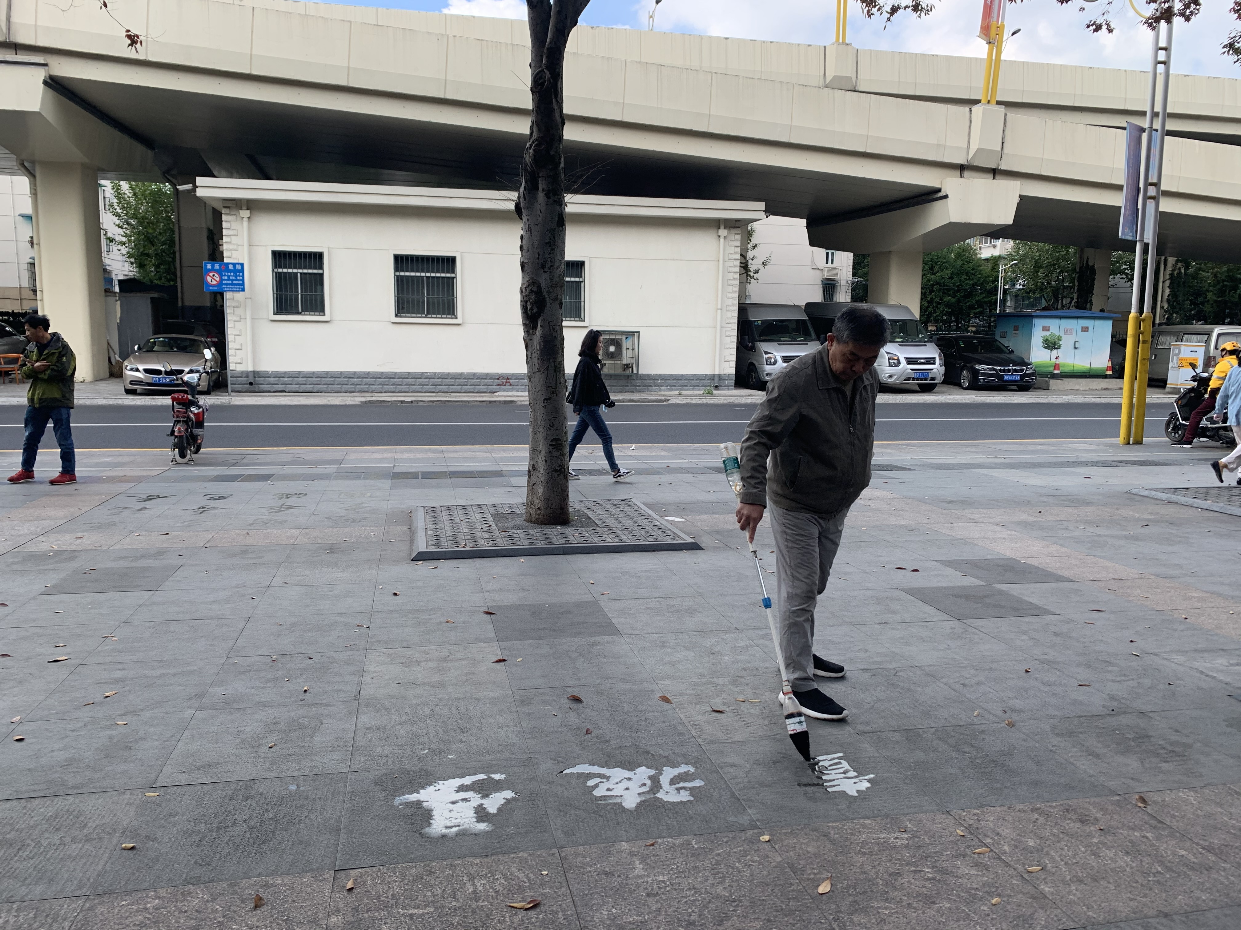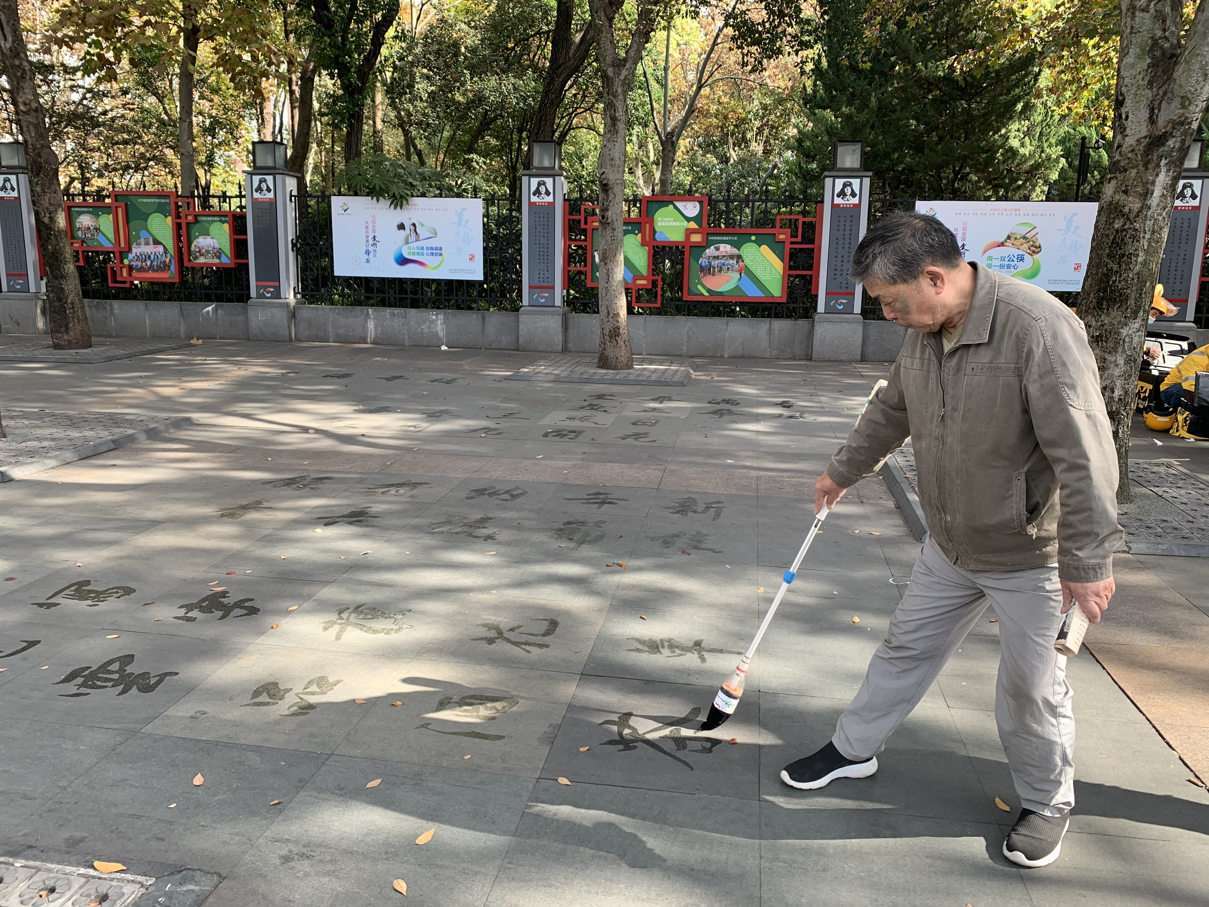 “读书写字种花草,听雨观云品酒茶。”上午9点,在闸北公园地书苑广场,书法爱好者杨国钿正挥毫“泼墨”,手握特制的笔,用水在地上写书法。今年72岁的他从退休后就开始练习书法,从5、6年前练习写地书。他表示,地书能够锻炼身体,还可以交到一批志同道合的朋友。