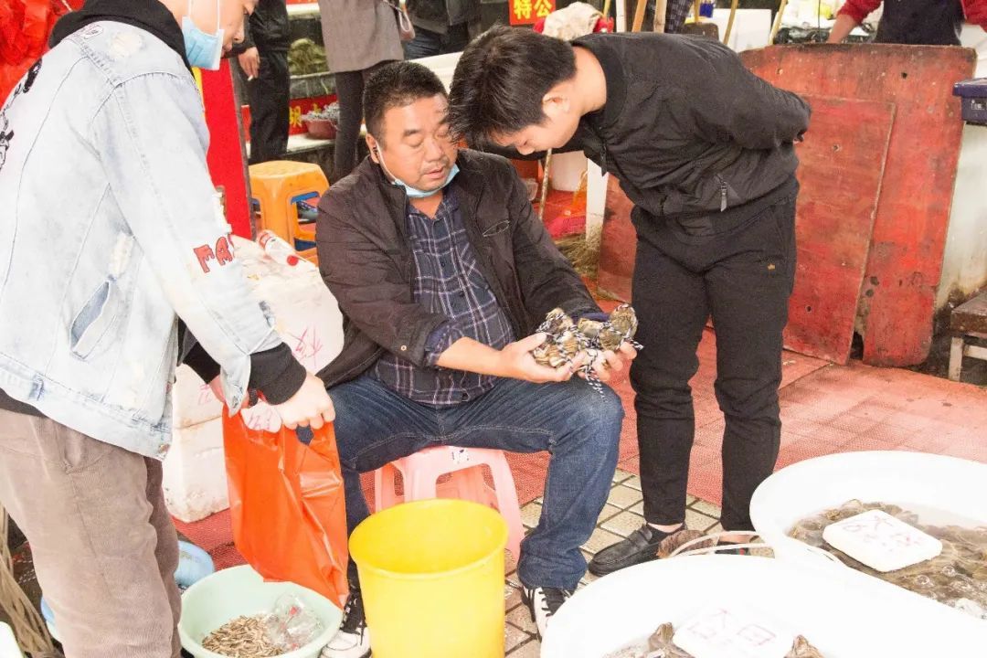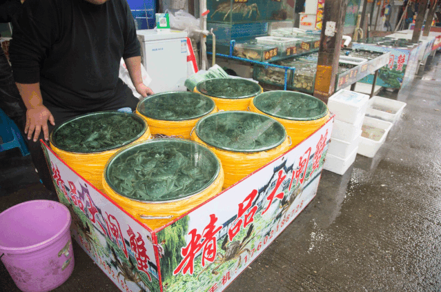 现场问了几位店家,今年宝山地区的市场上大部分都是太湖蟹,多产自于江苏,也有产自安徽、江西的闸蟹在销售。闸蟹店家万师傅介绍说,因为疫情关系,今年来市场的人流减少了很多,大闸蟹的价格相较于往年便宜了很多。不过市场管理方对整个市场进行了严格的防疫管理措施,卫生消杀工作也非常仔细,大家对市场安全方面还是很放心的。