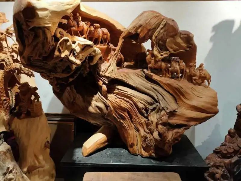 有了创作《丝绸之路》根雕的想法后,我找合适的材料就找了好久。根据材质的天然形状,我们在其中雕刻了骑骆驼的商人、背负货物的骆驼……希望这件作品像骆驼一样,将中国人民的真情送往远方。