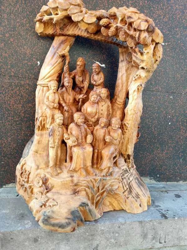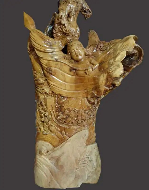 《中华大爱》选用千年古香樟,香樟树体有樟脑香气,材质坚硬美观,香樟也是我们仙居当地最多的木料。这件作品雕刻了一个家庭五世同堂的美好生活,绿水青山,生活水平不断提高,寿命不断增加,社会和谐。