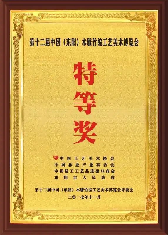 2017年,《福禄寿》、《花开富贵》作品在第十二届中国东阳木雕竹编工艺美术博览会荣获金奖和特等奖;