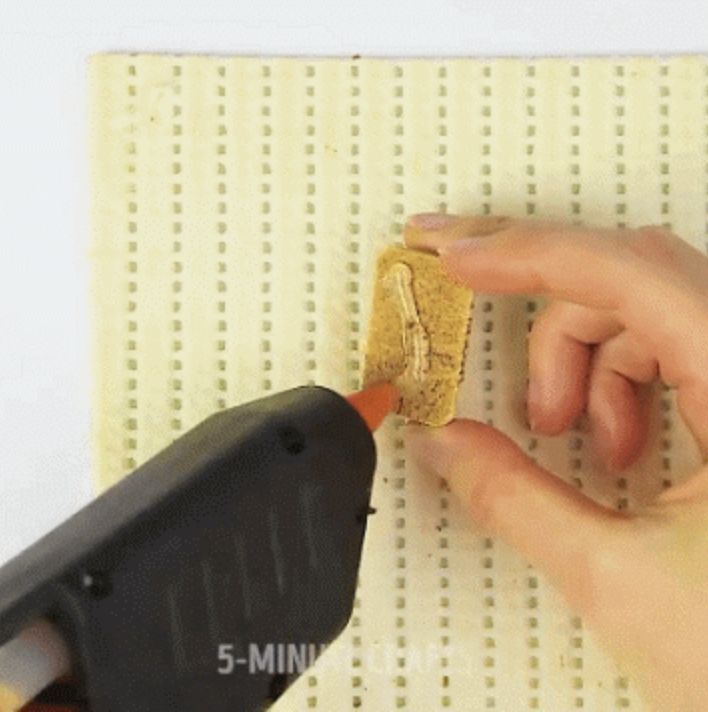 把收集到的每个红酒塞都从中切开,一分为二。之后用强力胶把他们粘在毛巾上,放在浴室门口的地毯就做好啦。