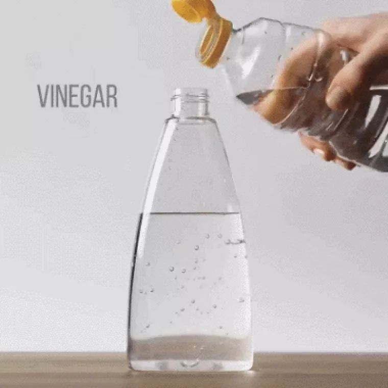 首先,在瓶中加入300ml清水,接着往里加入约50ml白醋,最后再放入几支百里香,一瓶自制的清洁剂就完成了。