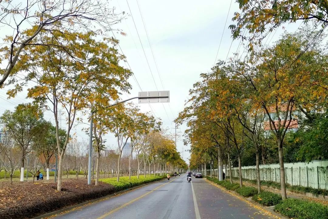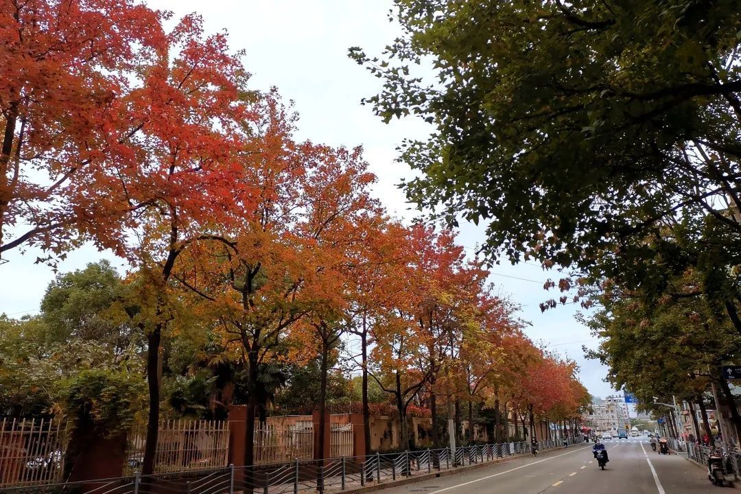 以零陵路南侧为界的枫林路上,则种植着漂亮的枫香,少许的弯道更加显出枫香绚丽之美。