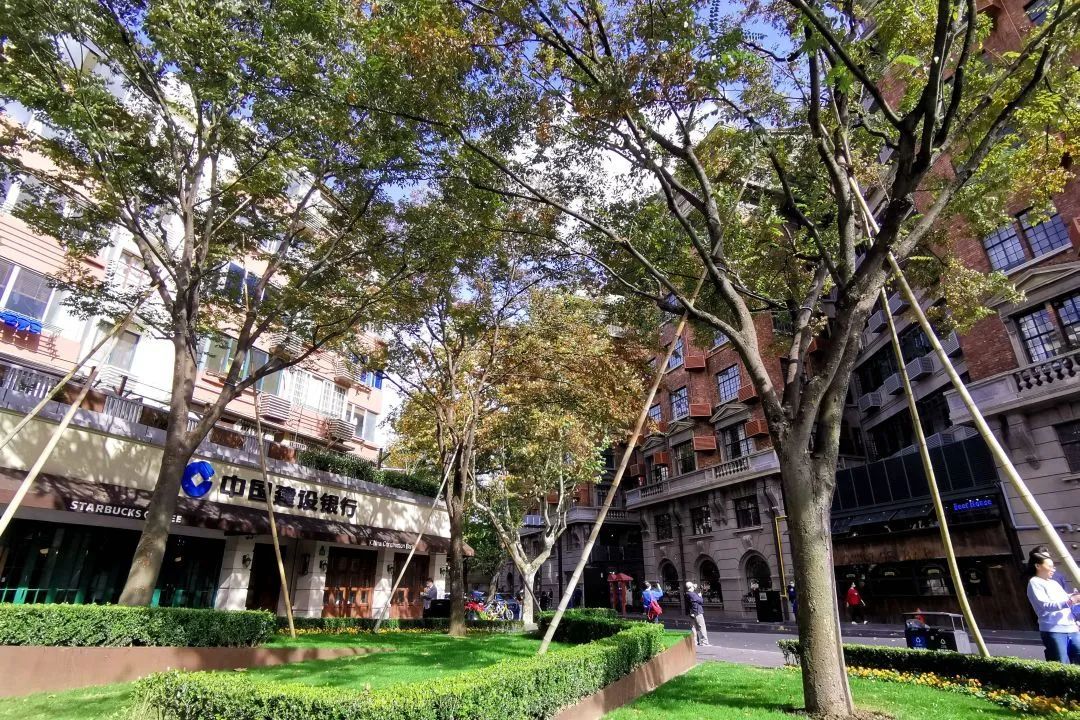 衡复风貌区的网红打卡地-武康大厦旁的这块绿地里,种植着三株大榉树,和耐候钢板、模纹绿篱组成法式元素。