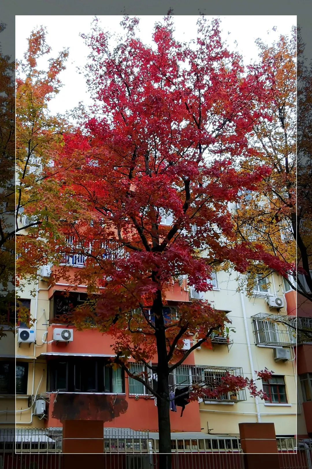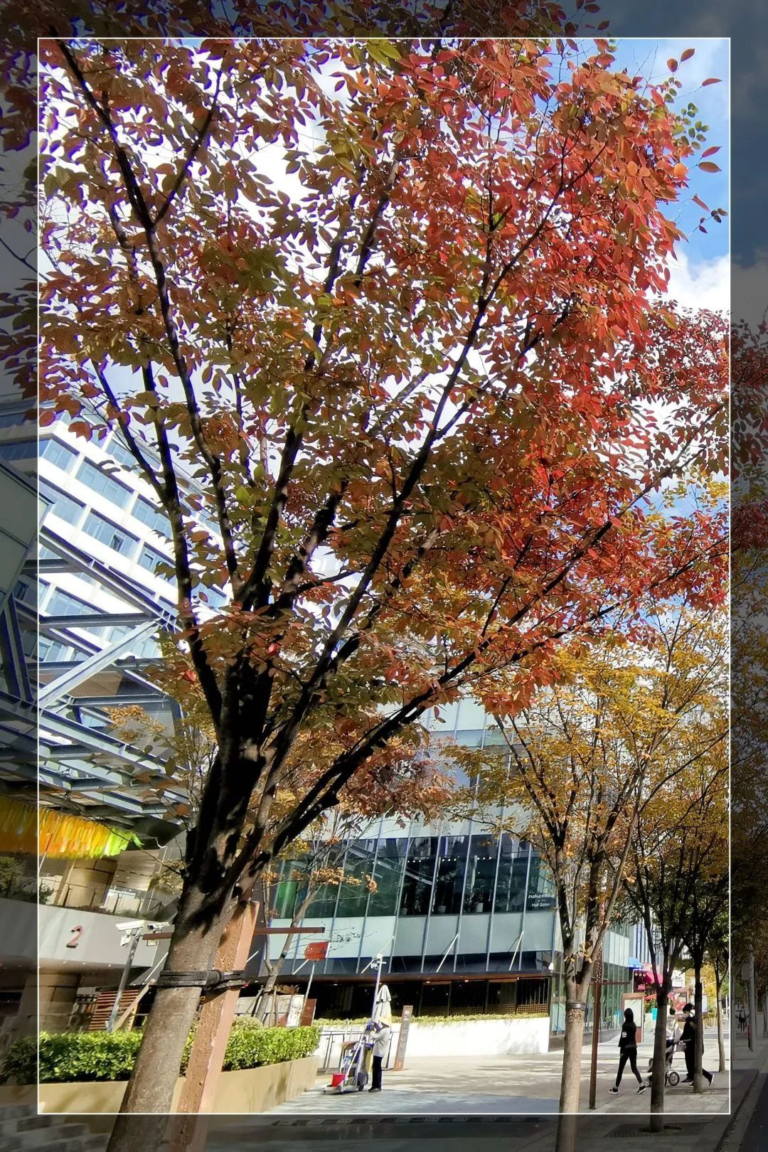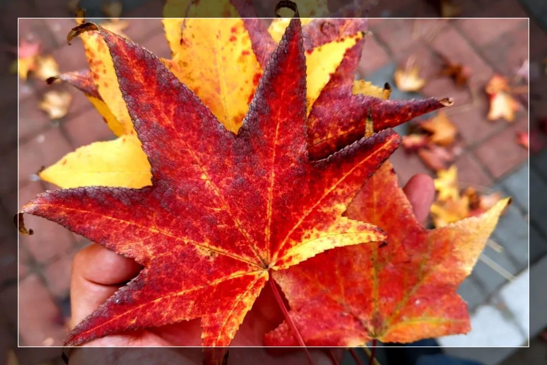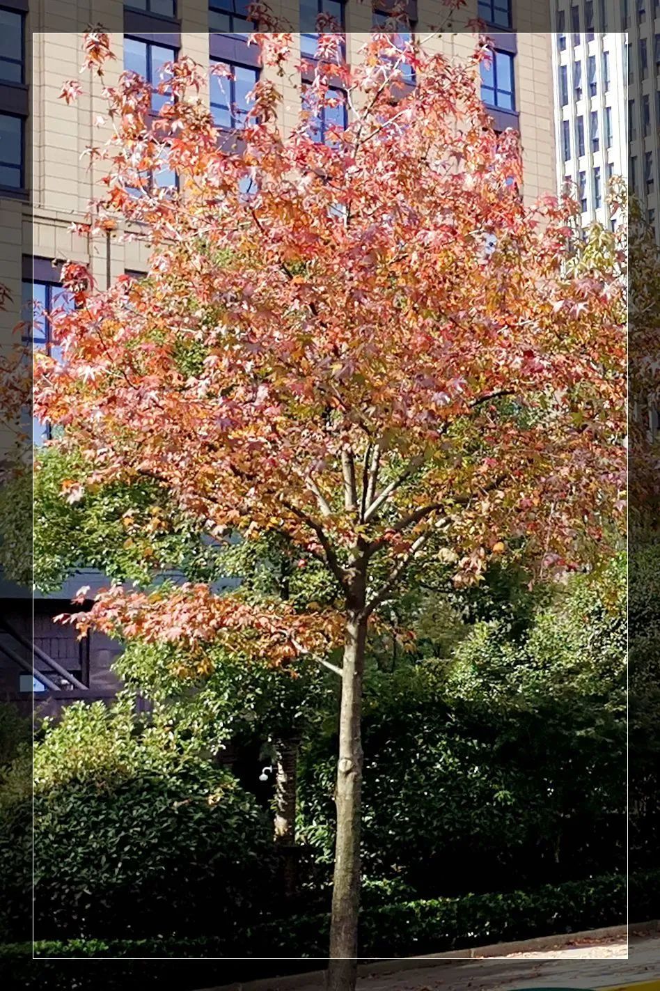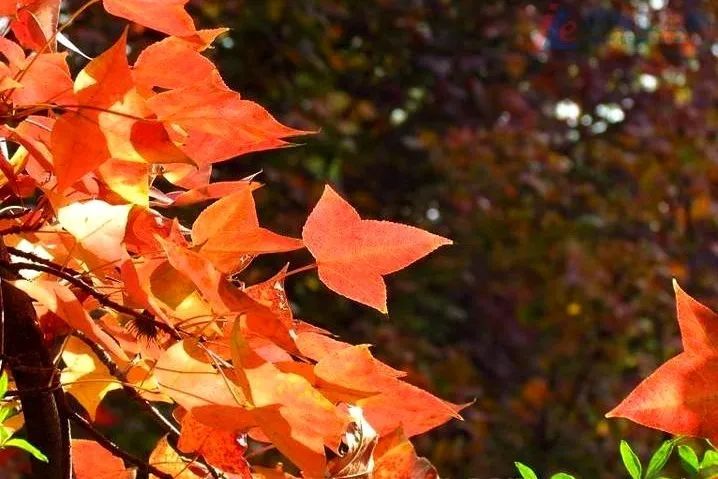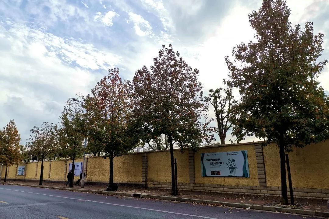 罗城路和嘉陵路比邻而居,这里的枫香高大壮丽,浑然一体。而罗城路北侧的枫香因光照条件更好,所以会先行变色。