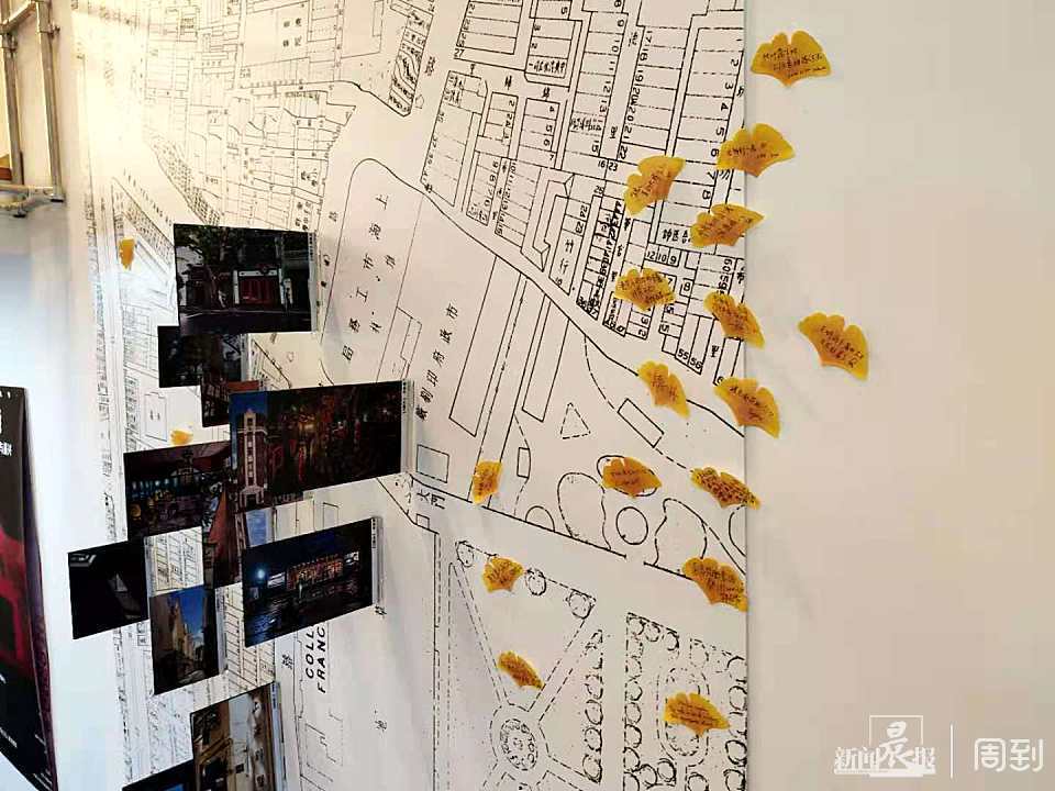 11月23日,记者走进这处空间,探访了正在这里举行的“遇见·南昌路”摄影展。整个空间被分隔为上下两层。底层入口处的门厅铺着老式木地板,靠墙的茶几上摆放着银杏叶形状的便笺。一幅放大版的1945年南昌路街区地图从墙上垂到地上,呈“L”型展开。有关南昌路地标建筑、弄堂风貌的摄影作品被贴在地图的对应点位上,这样一来,哪个位置是什么模样,观众就能一目了然。