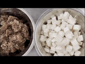 番茄煮粗粮、豆茸鸡肉饼、扣碗鸡块