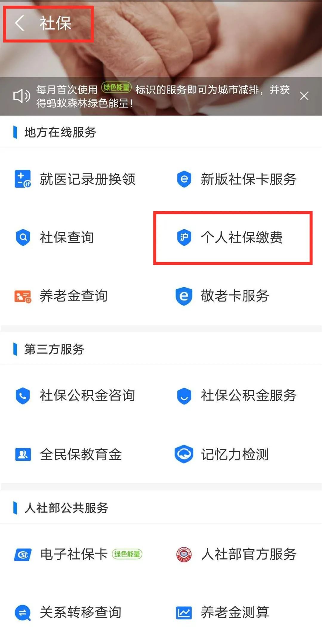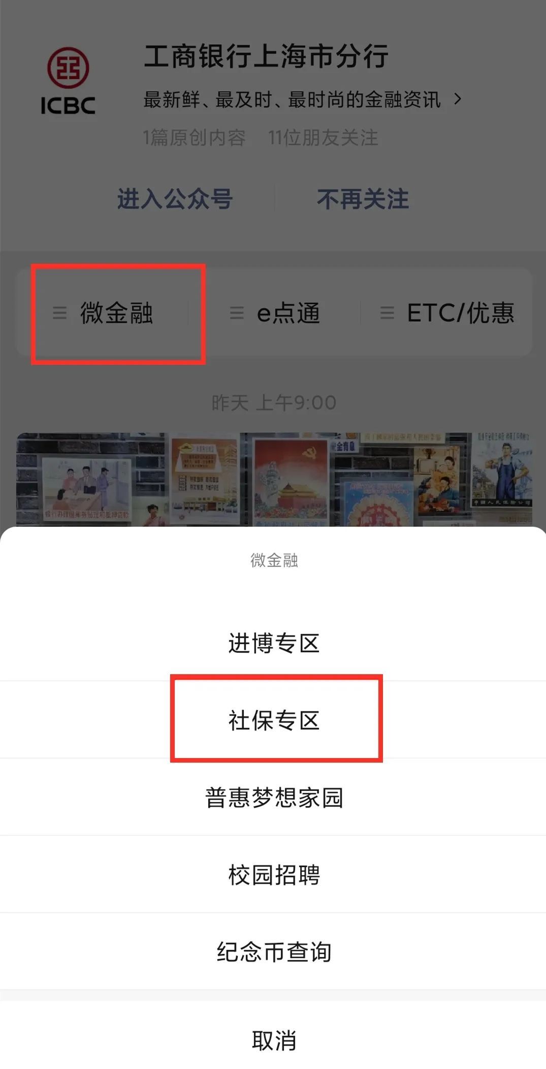 关注“工商银行上海市分行”微信公众号,选择【微金融】-【社保专区】-【个人社保缴费】