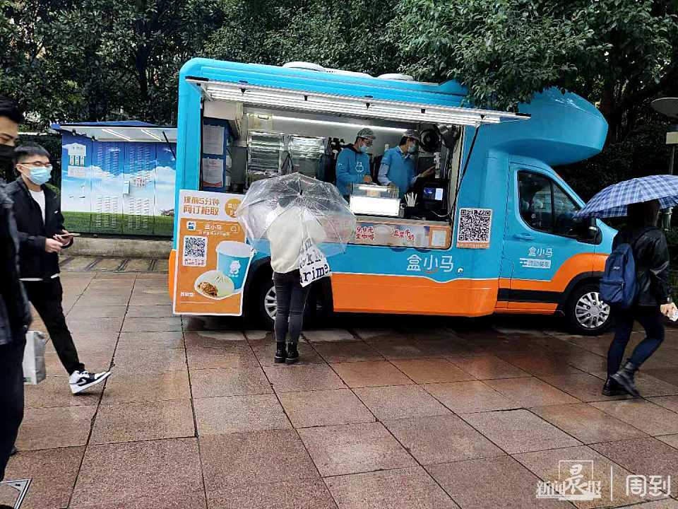 而在现有的早餐点中,“网订柜取”的早餐新模式已被流动早餐车、便利店广泛采纳。以人民广场地铁站11号口外的盒小马早餐车为例,车的后部装有自助取餐格和扫码装置。顾客只要在手机APP上提前选好餐品下单,店员就会开始准备。等顾客到达餐车时,扫一扫二维码就能立刻取走。