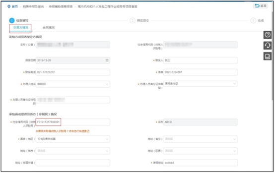 1.进入“境内机构和个人发包工程作业或劳务项目备案”功能模块,填写交易方情况信息以及合同相关信息;