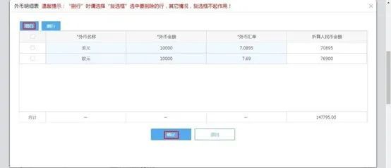 如果为外币支付:点击“外币明细表”进行填写。可以通过【增行】增加不同外币的支付金额。填写完成后点【确定】。