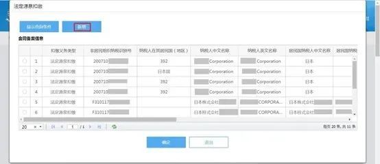 注意:系统自动跳出已进行信息采集或备案的合同信息,拖动横向进度条,根据“合同编号”选择对应的合同后,点击【确定】。若列表中没有对应合同,则点击【新增】,跳转到“源泉扣缴合同信息采集”或“境内机构和个人发包工程作业或劳务项目备案”模块,进行信息采集或备案。