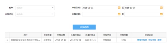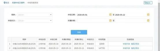 点击“确定”后发送申报表。发送成功后系统自动跳转至申报查询页面。该页面可以查询到已申报的记录,可以对记录进行“申报作废”、“缴款/查询”。