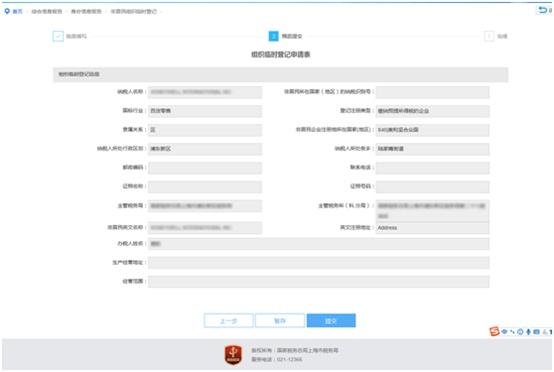 其中,非居民企业输入纳税人识别号后,会自动带出已登记信息。如未完成组织临时登记,可点击下方【快速登记】链接跳转至模块一进行登记。(参照本文“第一步 非居民组织临时登记”)