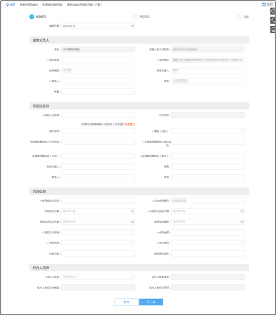 1.进入“源泉扣缴合同信息采集”功能模块,填写表单。填写完表单信息后,可点击【下一步】;