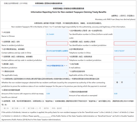 若享受税收协定待遇,请填写“非居民纳税人享受协定待遇信息报告表”: