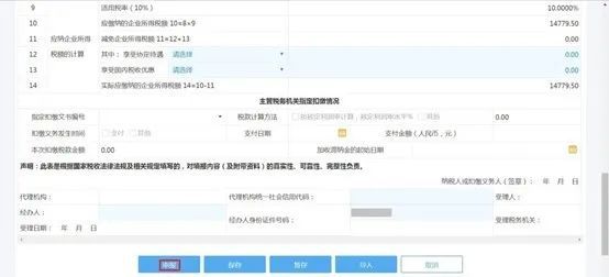 系统会自动计算“应纳税所得额”、 “应缴纳的企业所得税额”。填写“经办人”名字及“经办人身份证号码”后,点击“申报”。
