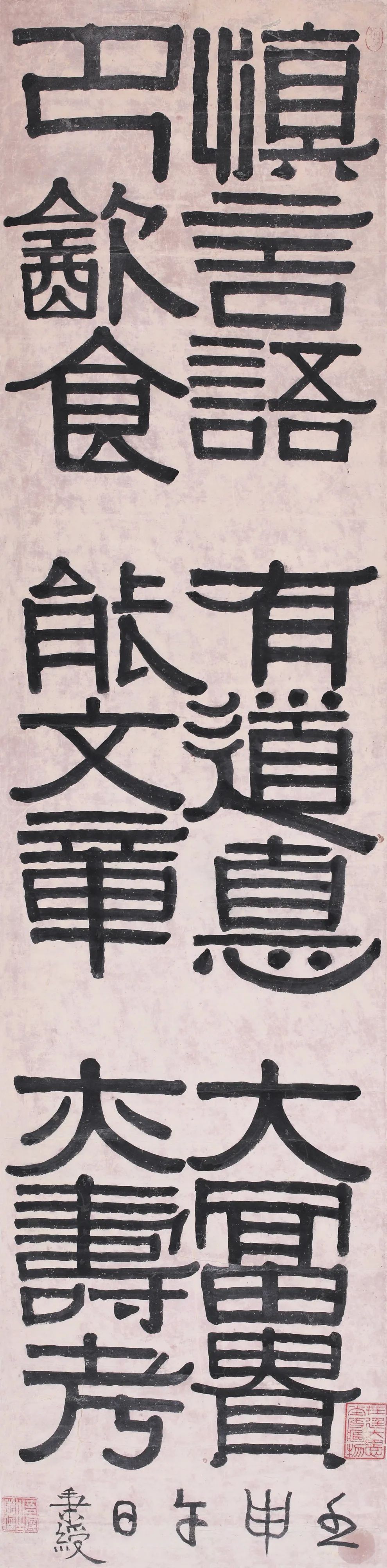 说起“有缘”,童衍方指着一幅挂在客厅里的伊秉绶隶书轴,说起一个久远的故事:20多年前,童衍方到日本访问,在日本隶刻界泰斗小林斗庵的书房中第一次见拿到这幅隶书轴。这件作品轴高138厘米,宽33.7厘米,上书:“慎言语,节饮食,有道德,能文章,大富贵,亦寿考。壬申午日秉绶。”伊秉绶在清代与邓石如、金冬心并称隶书三大高手,这件隶书的章法也颇为独特,布字顶天立地充塞四边,却毫无闷实之感,反而愈显精神,其妙处在于以三段六字格言吉语联成一幅整体,每段巧留空隙使之透气,每段字离气不离,承上启下一气贯注,因此给童衍方留下了深刻的印象。2000年,童衍方到东京银座举办书法展,小林斗庵前来剪彩。这样,童先生再次到小林斗庵家做客,又一次见到了这件作品。这次童先生拍了照片,回来后还写了一篇《东瀛观伊秉绶书法》的文章。2003年,童先生再访日本,到小林斗庵家仍想再看一看这幅字,却看到换成了一幅邓石如的书法,心中不禁怅然。然而,这幅伊秉绶的隶书轴似乎与童先生就是有缘,去年,它出现在国内的一次拍卖会上,一打听,果然是从小林斗庵家中流出。童衍方果断出手,终于将这件关注了近20年的佳作收入囊中。