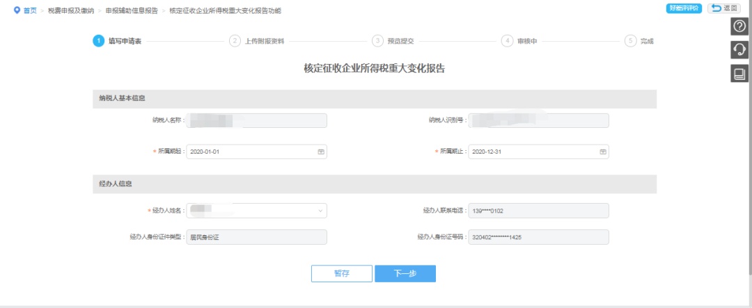 系统自动带出当前纳税人名称、纳税人识别号;纳税人需要填写发生重大变化对应需要重新鉴定的所属期起止时间,无法选择2020-01-01之前的时间;选择经办人姓名,自动带出经办人信息。