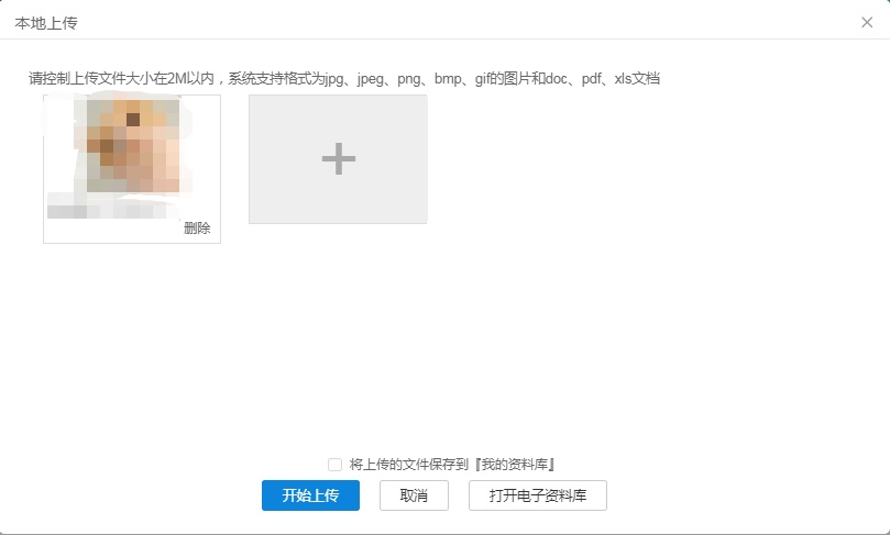 2.将附报资料上传至电脑端,选择本地上传,点击“+”,选择本地文件,上传成功后即完成。同时可勾选“将上传的文件保存到【我的资料库】”中,以备下次使用。
