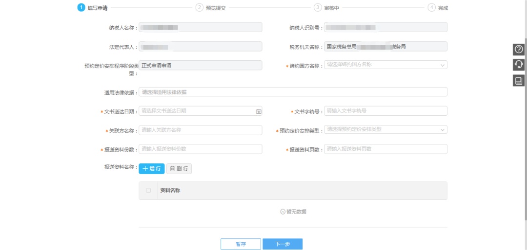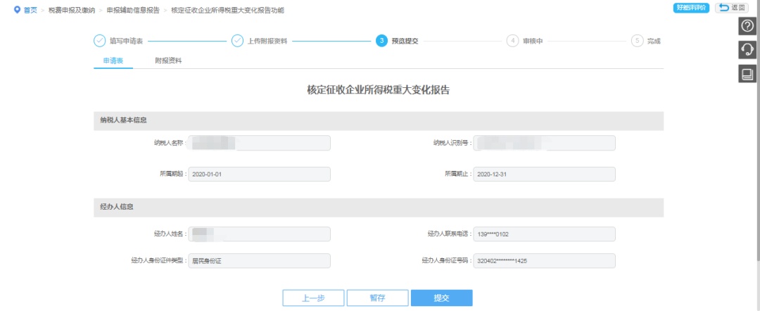 点击暂存,自动保存本次录入信息,下次登入功能时回显;点击“下一步”,进入预览提交页面。