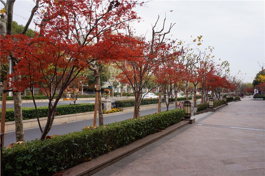 道路以隔离带红枫为主,下植月季等开花植物,打造了春夏两季观花、秋季观花观叶的绿化特色景观。最佳观赏期为11~12月。