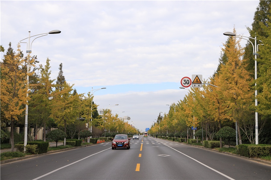 道路以行道树银杏为主题特色,以木槿、石榴等开花植物等开花地被为辅,打造了春夏观花、秋季观叶的绿化特色景观。最佳观赏期为7~12月。