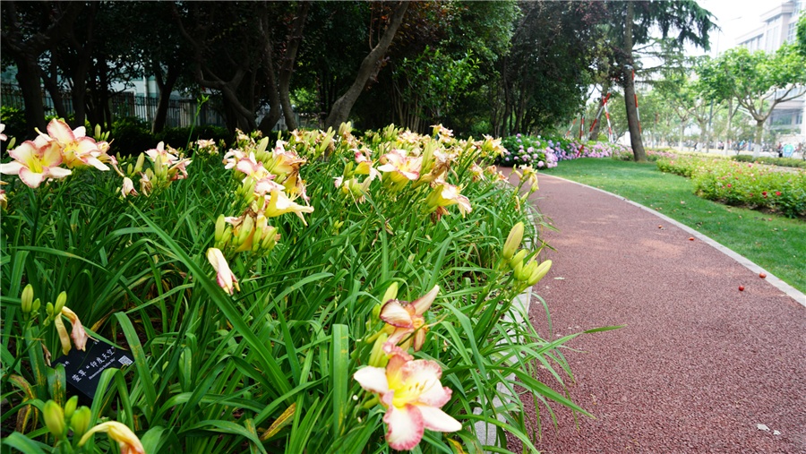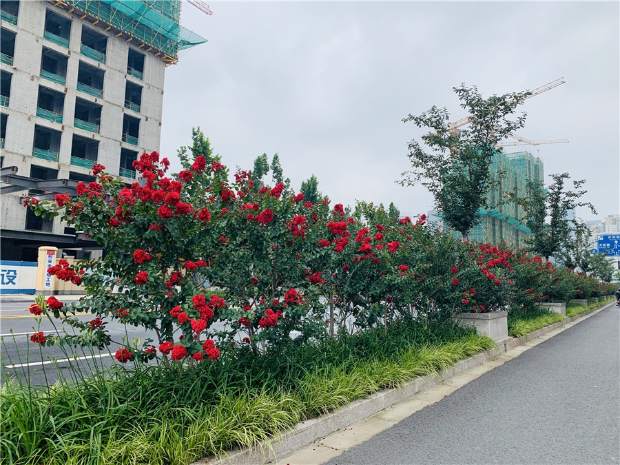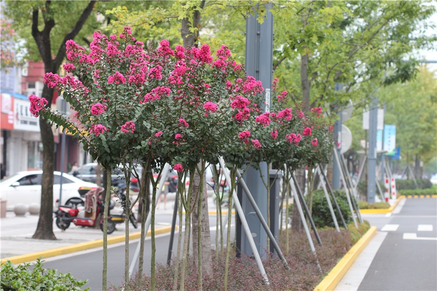 道路以榆叶梅、红叶李、红梅、金桂、紫荆、紫薇、樱花、石榴、贴杆海棠、石蒜、玉簪等开花植物,打造了四季有景的绿化特色景观,植物品种丰富,配置自然。最佳观赏期为7~9月。