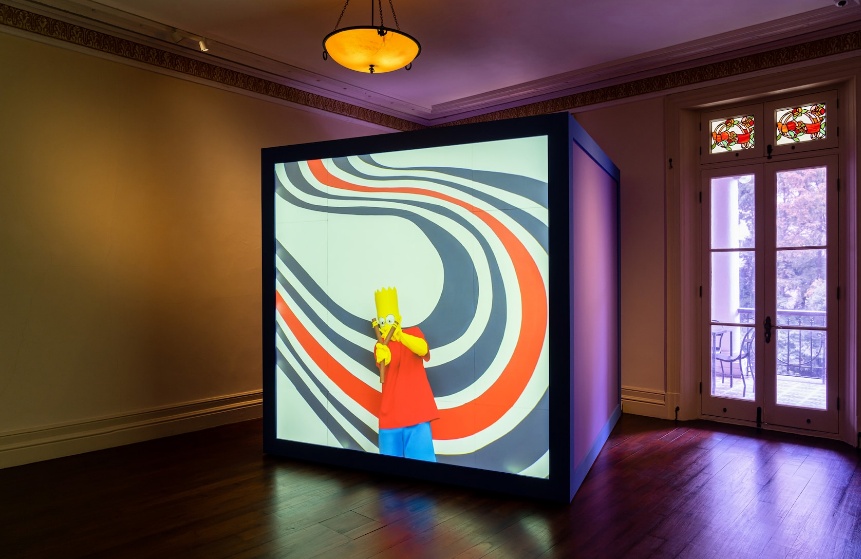 但这段影片,并不是一次性完整呈现,而是被分幕投影于两层楼的19个立方体上,因此你会在同一空间的同一时间,看到交叉混合的动画影像。非线性叙述的方式,也许会让人感到混乱,但这正是Da Corte的“心机”所在。
