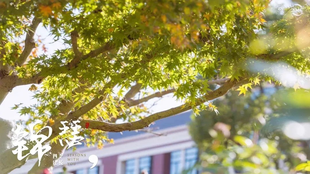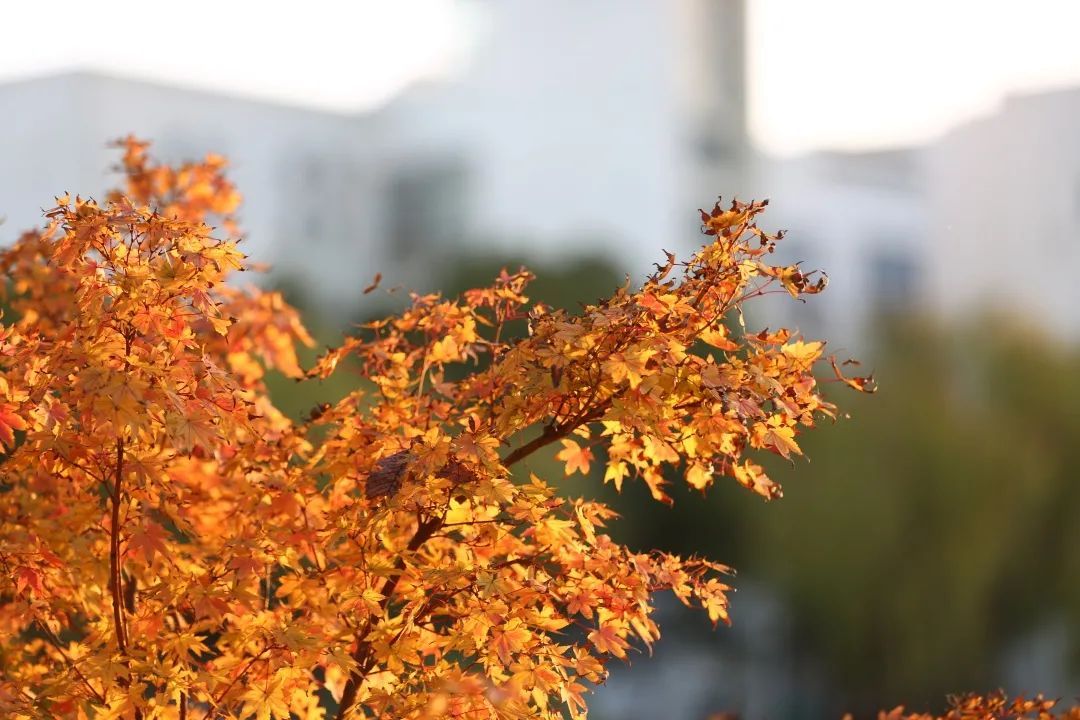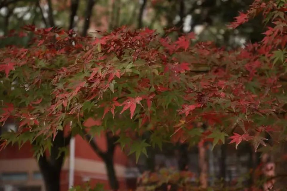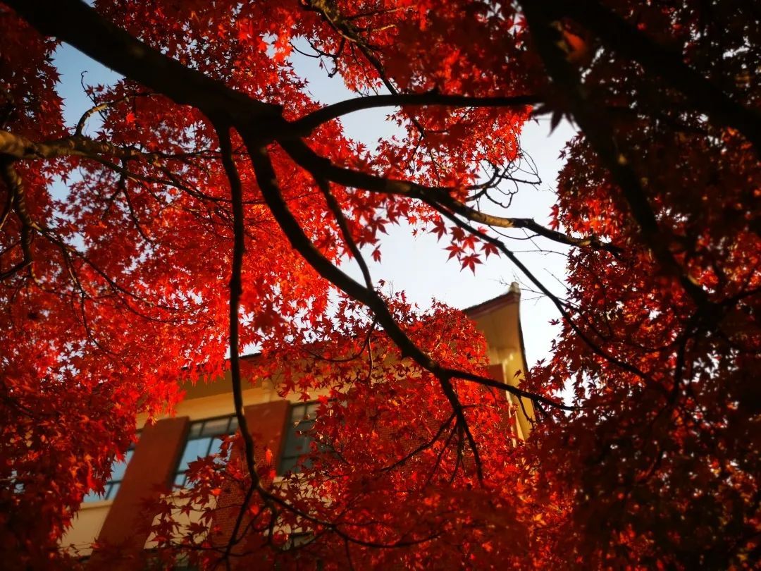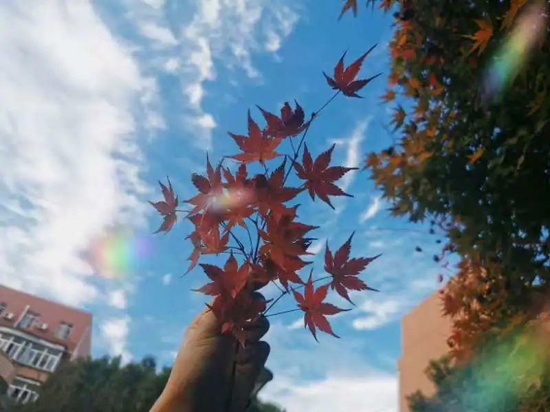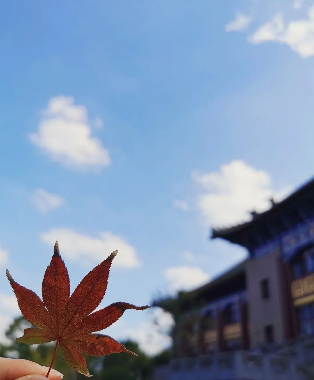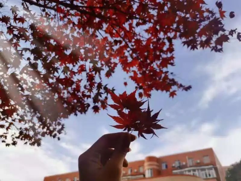 秋天的温柔藏在稀薄的云,蔚蓝的天,秋天的包容藏在赤红的枫,暗绿的叶。暖而不烈的阳光洒在绿瓦大楼上,我们与枫叶定格秋天最好的模样。