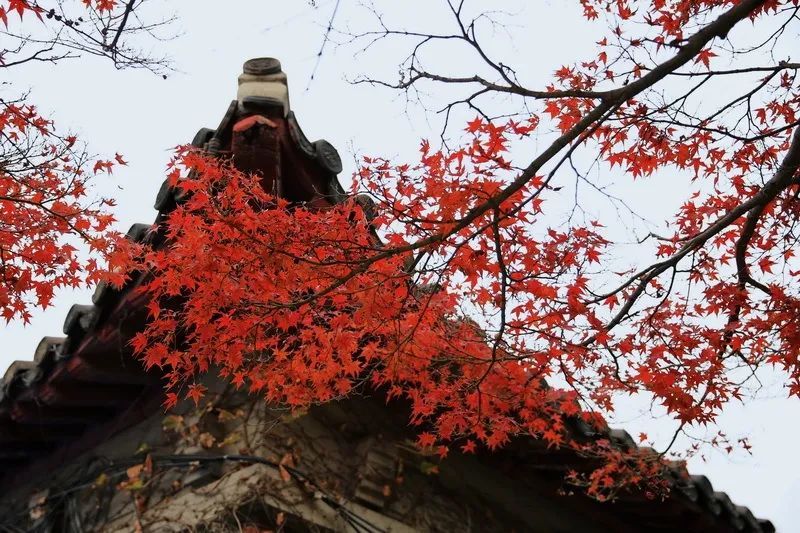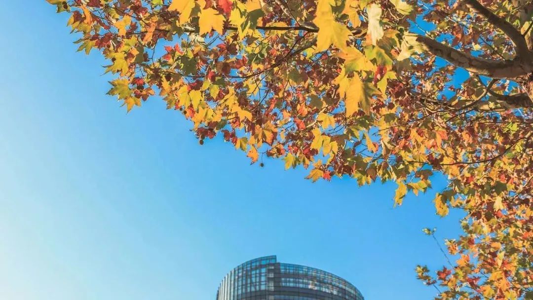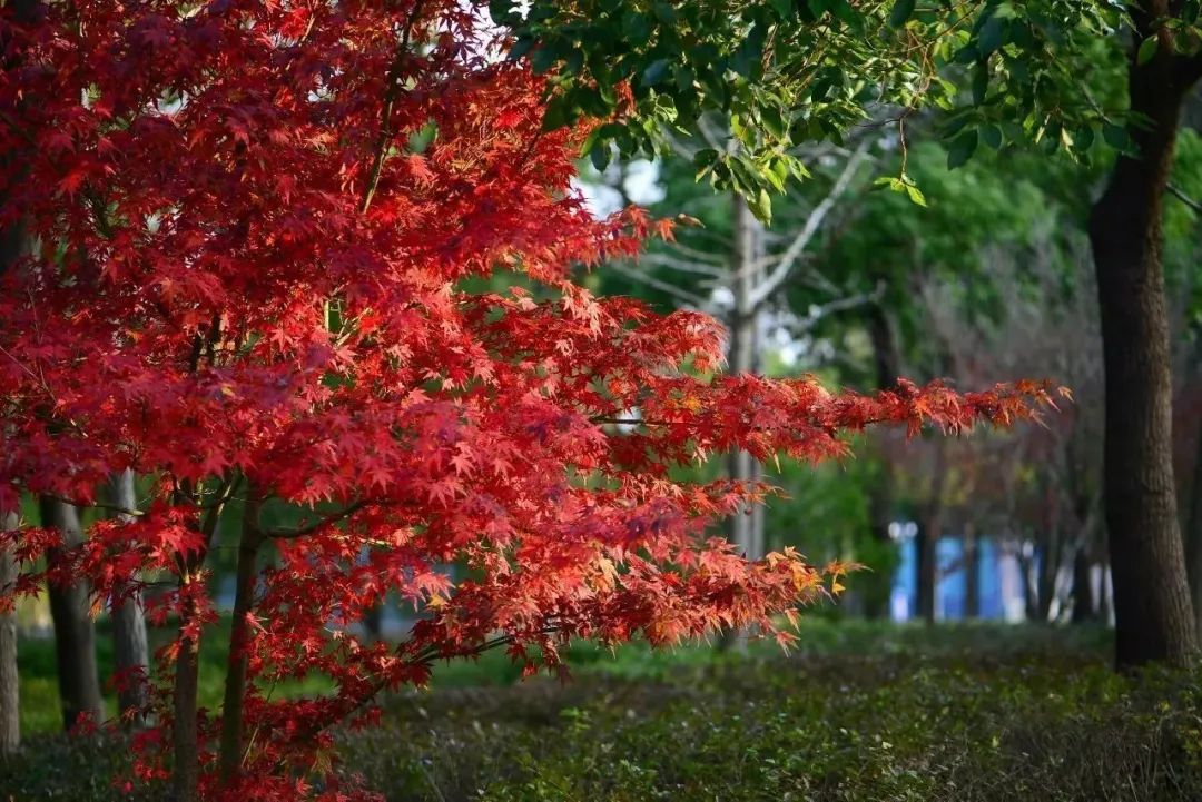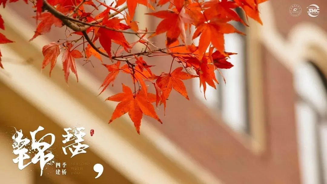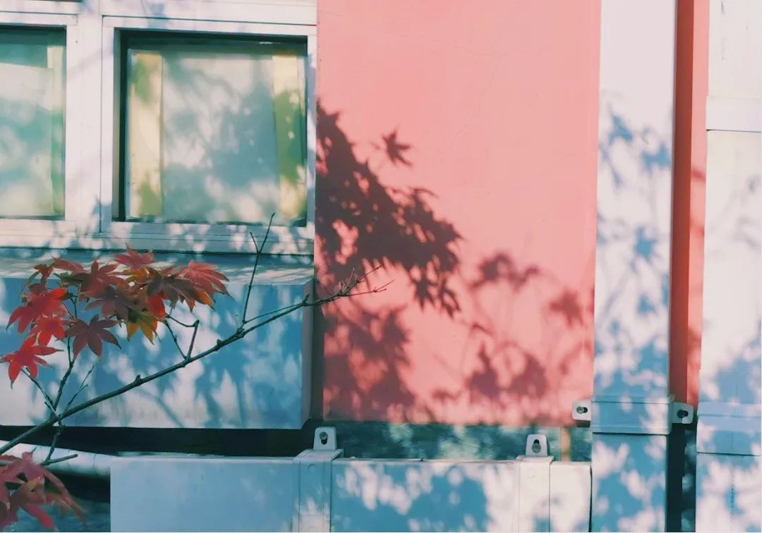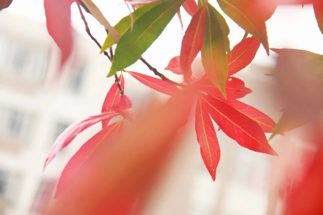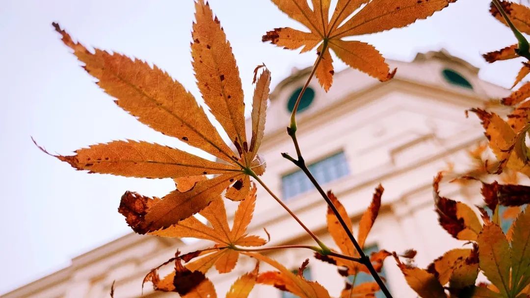 秋天的温柔藏在稀薄的云,蔚蓝的天,秋天的包容藏在赤红的枫,暗绿的叶。暖而不烈的阳光洒在绿瓦大楼上,我们与枫叶定格秋天最好的模样。