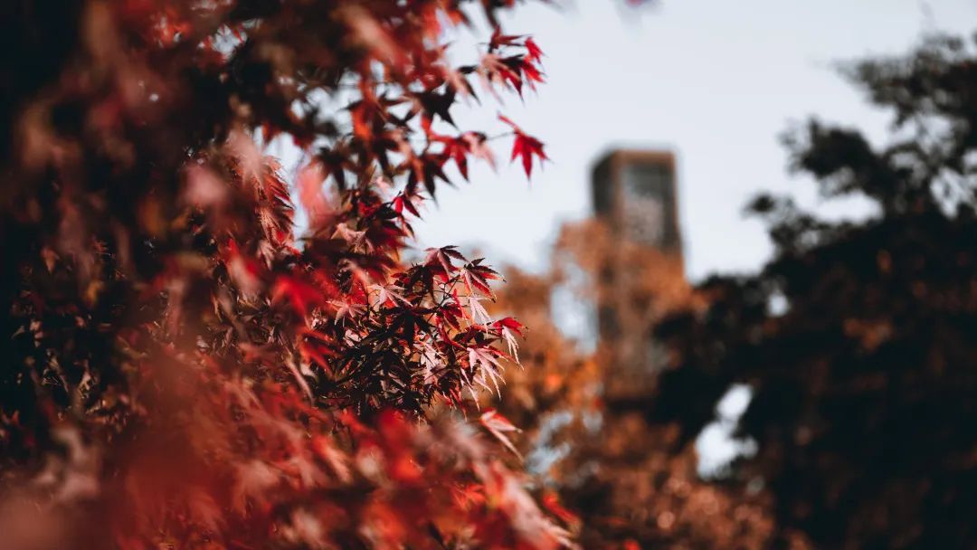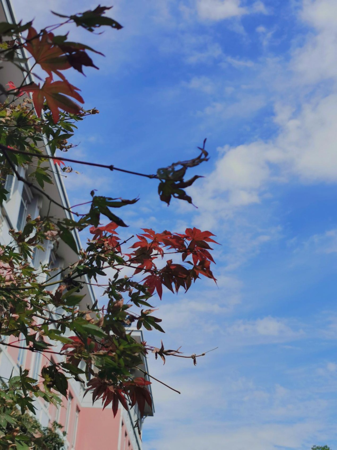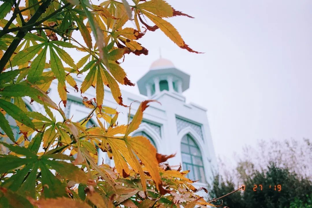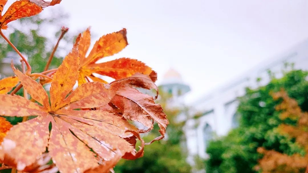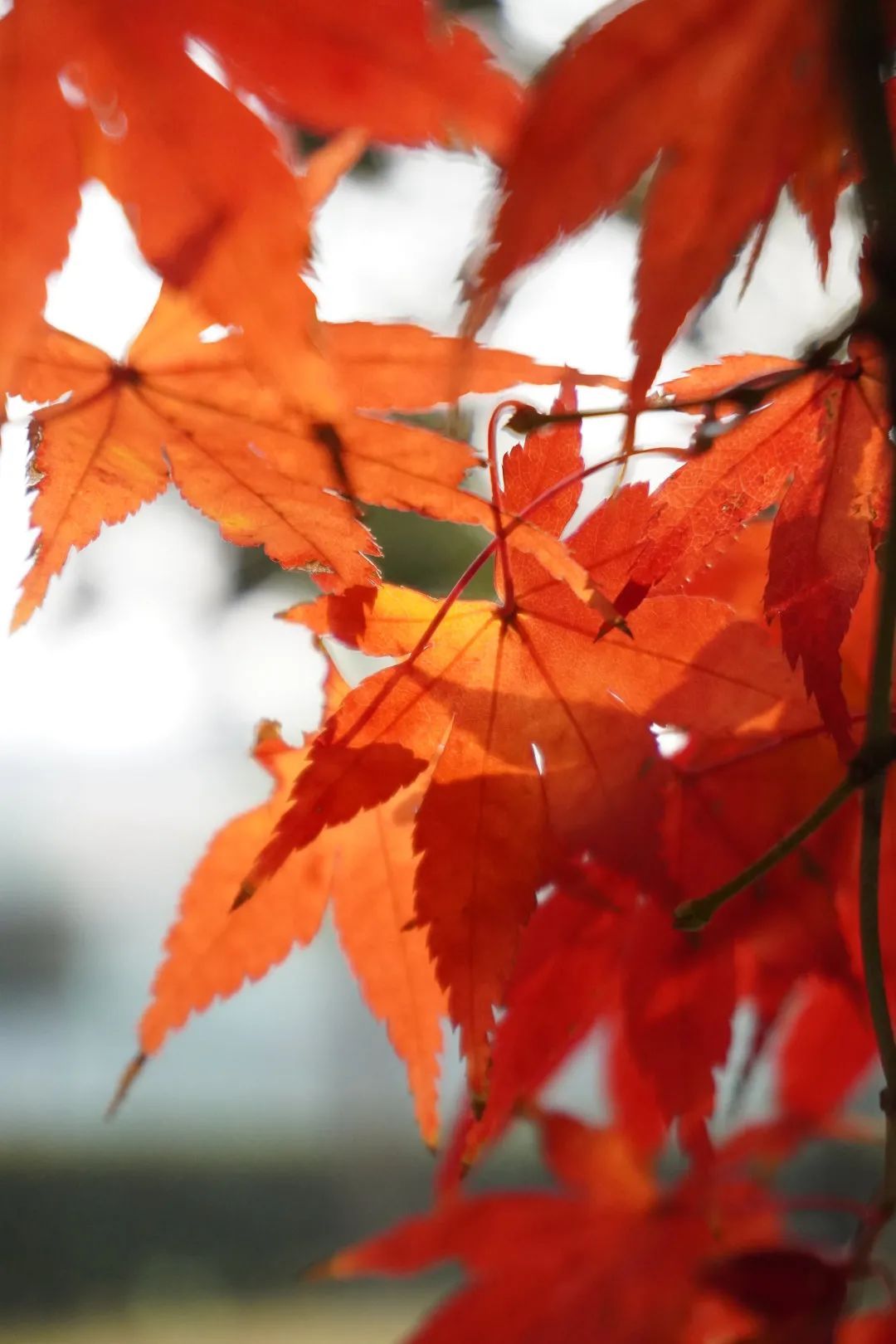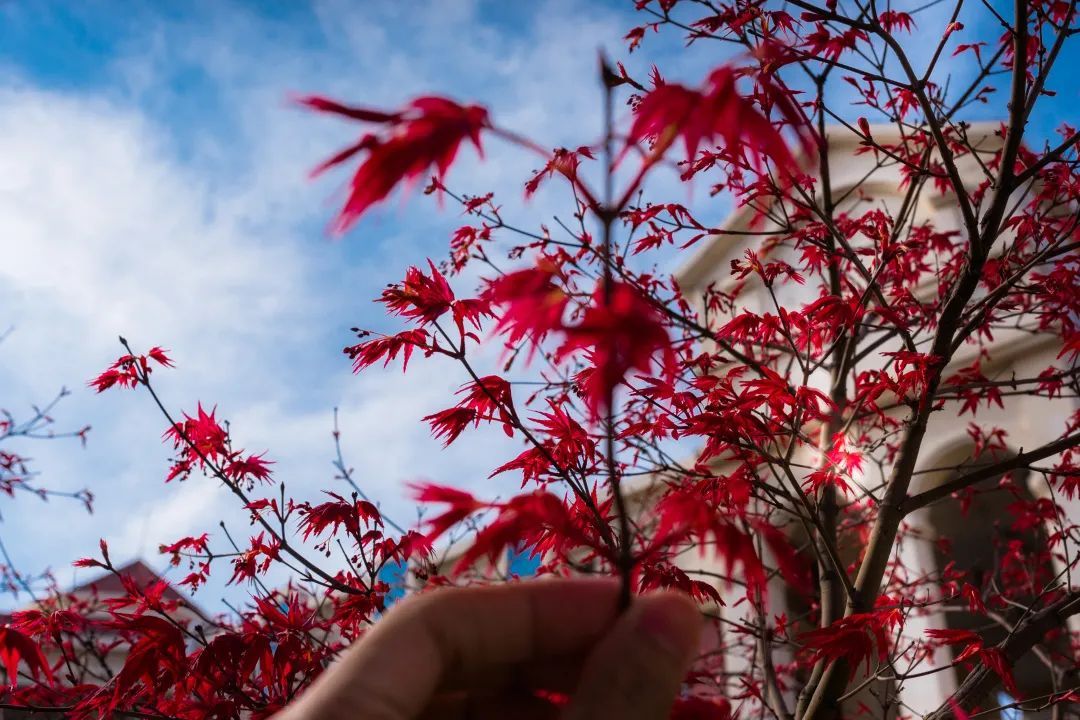 秋天的温柔藏在稀薄的云,蔚蓝的天,秋天的包容藏在赤红的枫,暗绿的叶。暖而不烈的阳光洒在绿瓦大楼上,我们与枫叶定格秋天最好的模样。