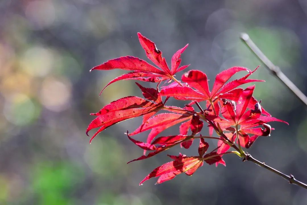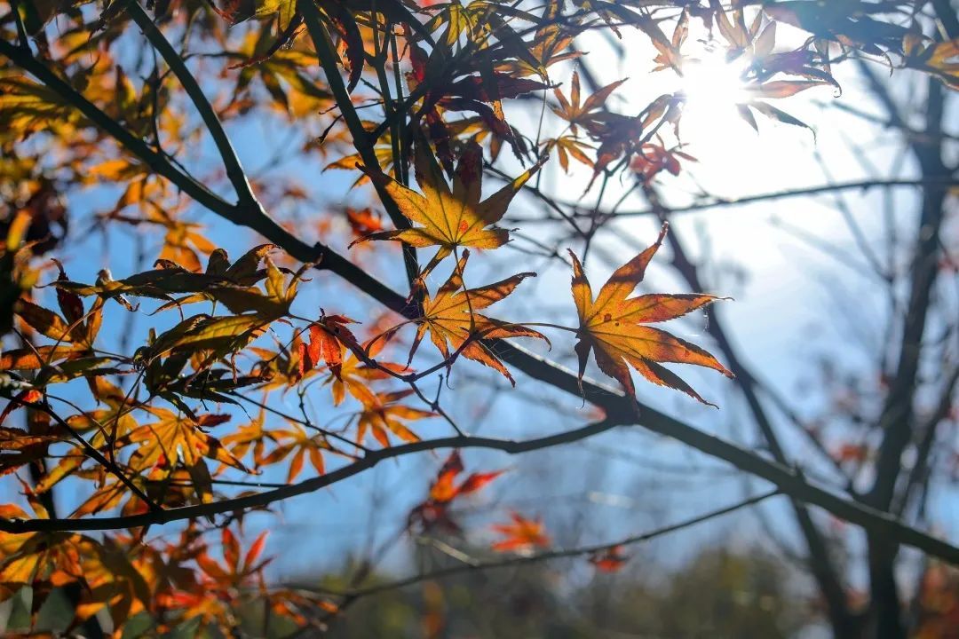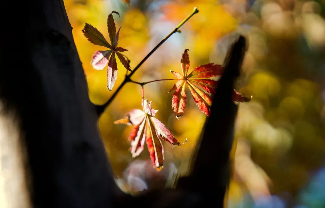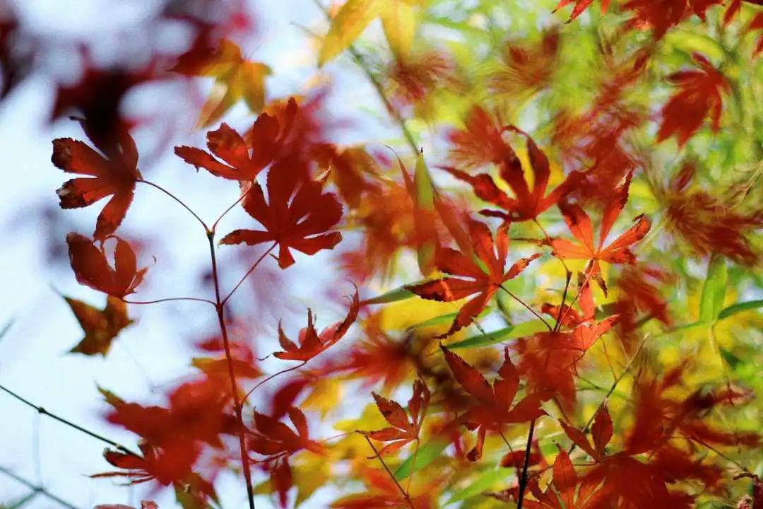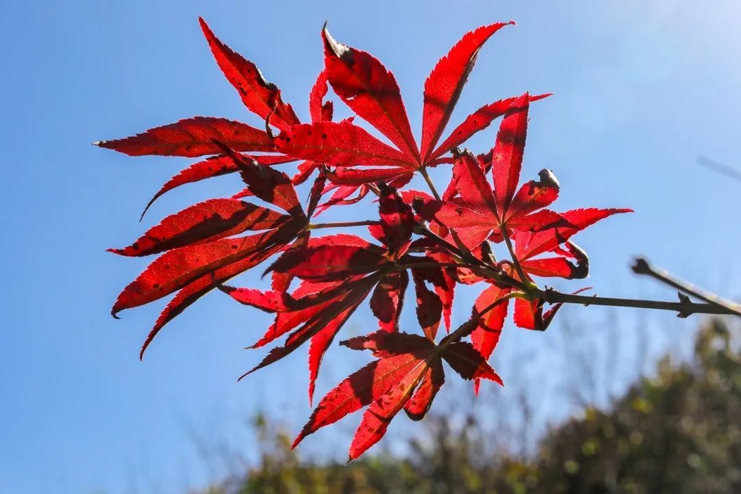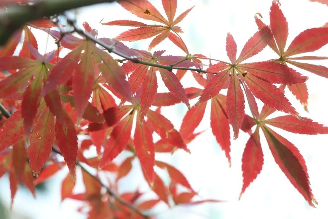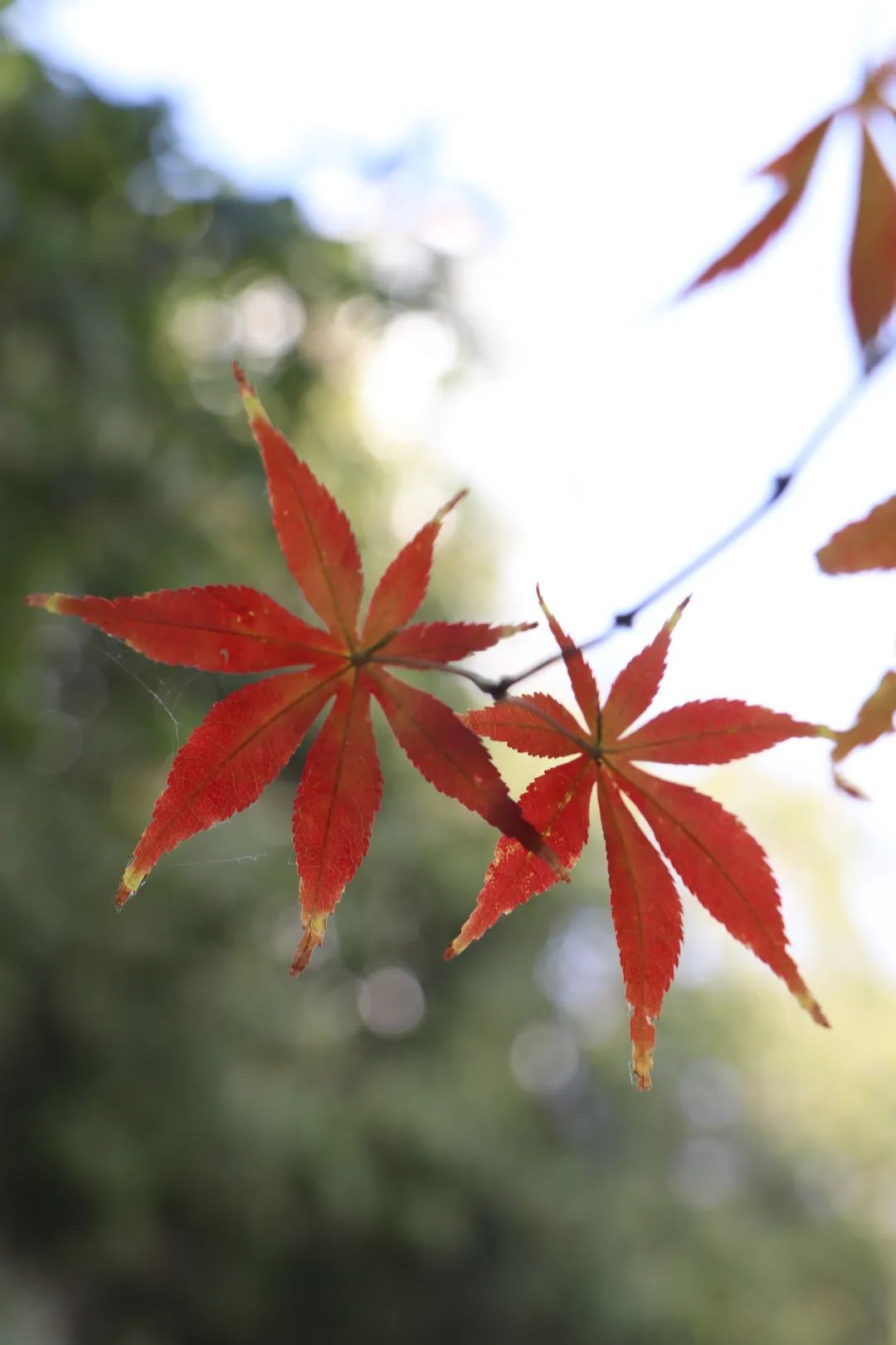 些许上层的枫叶开始卷边、泛黄变褐,随而陆续飘落,扑向大地。微风吹来,深褐色的卷叶和红色的枫叶叠荡飘扬,走近细瞧,红色如泼墨般向叶尖延伸,透过阳光,叶脉清晰伸展,仿若一幅最美的油画。