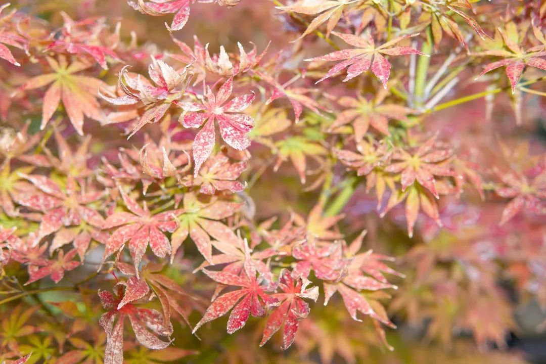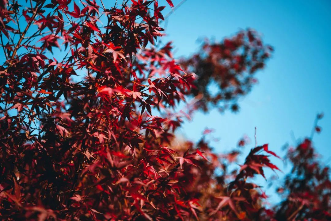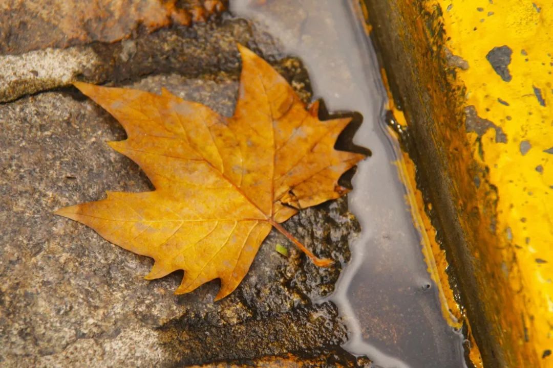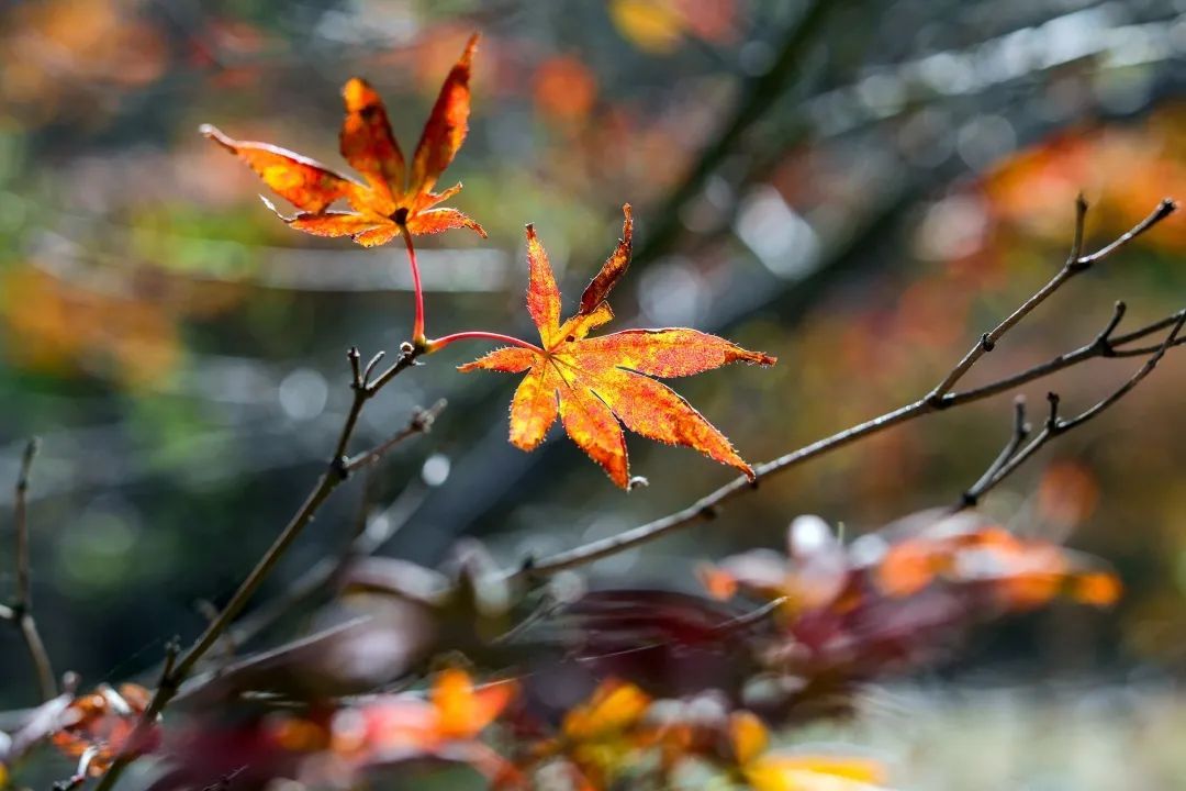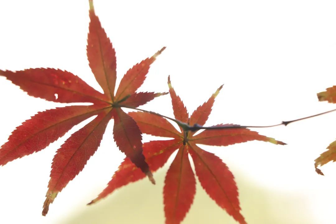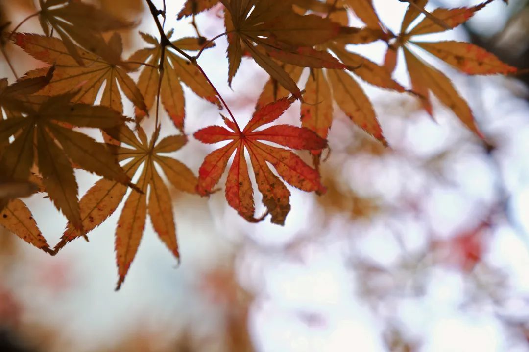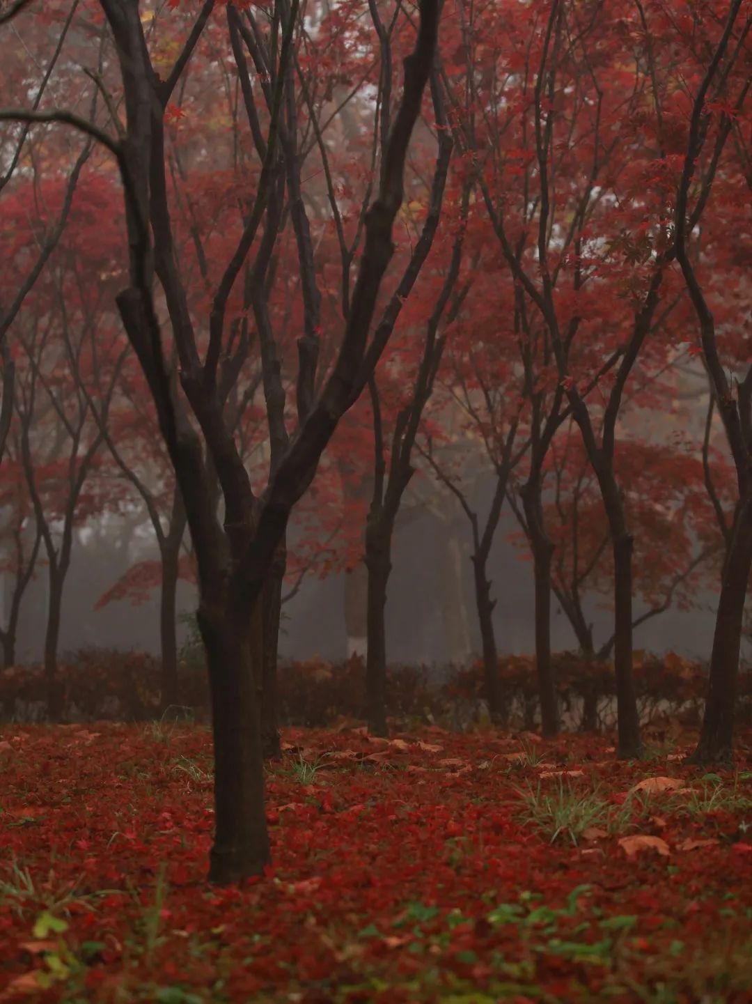 些许上层的枫叶开始卷边、泛黄变褐,随而陆续飘落,扑向大地。微风吹来,深褐色的卷叶和红色的枫叶叠荡飘扬,走近细瞧,红色如泼墨般向叶尖延伸,透过阳光,叶脉清晰伸展,仿若一幅最美的油画。