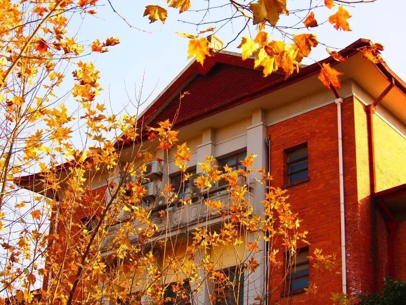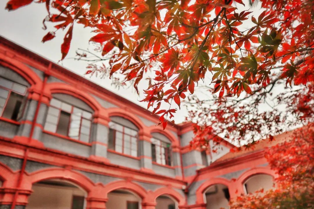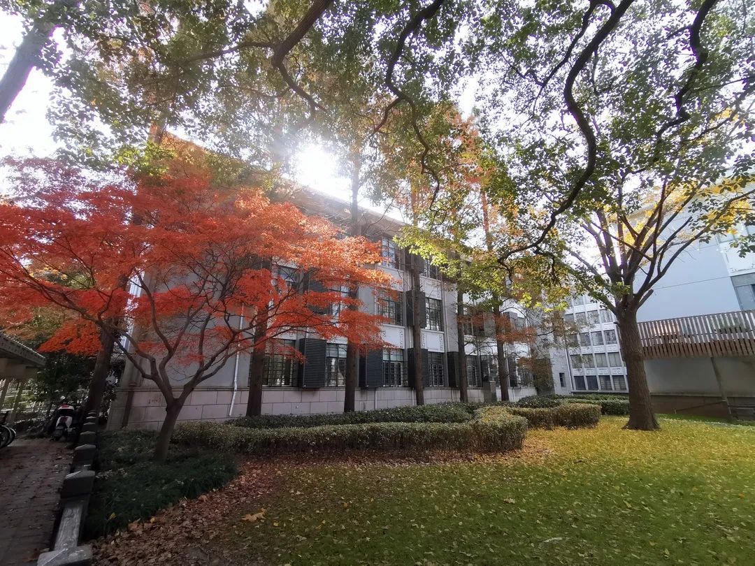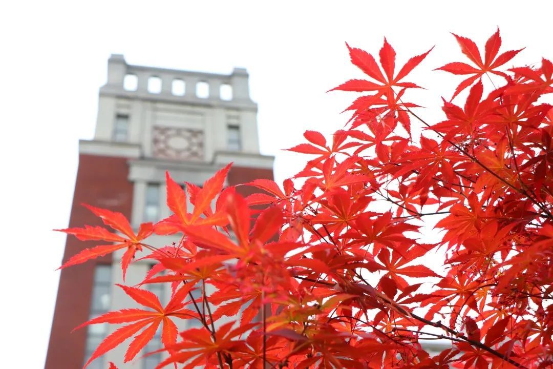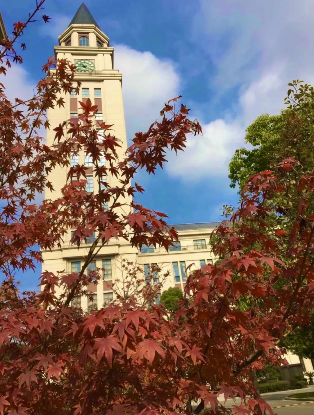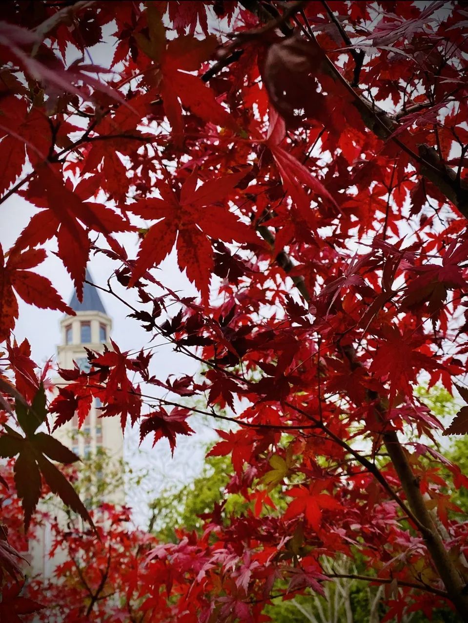 赏枫地点:长宁校区东风楼前,松江校区明法楼下。