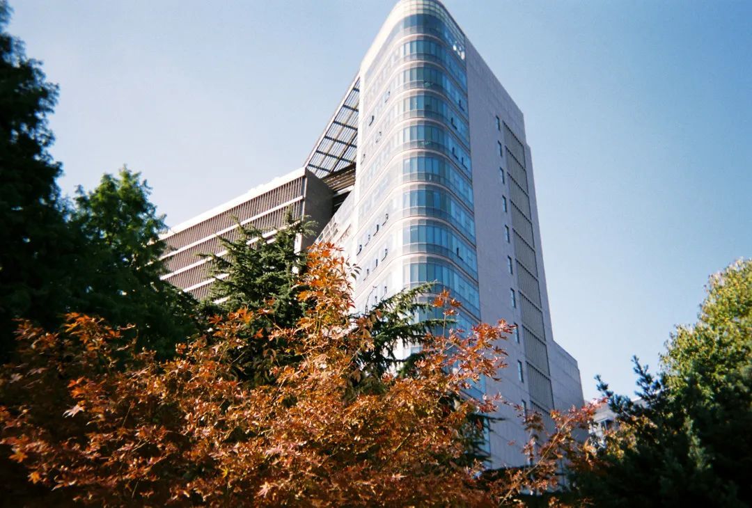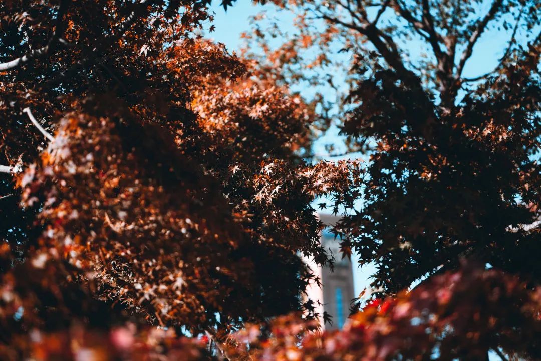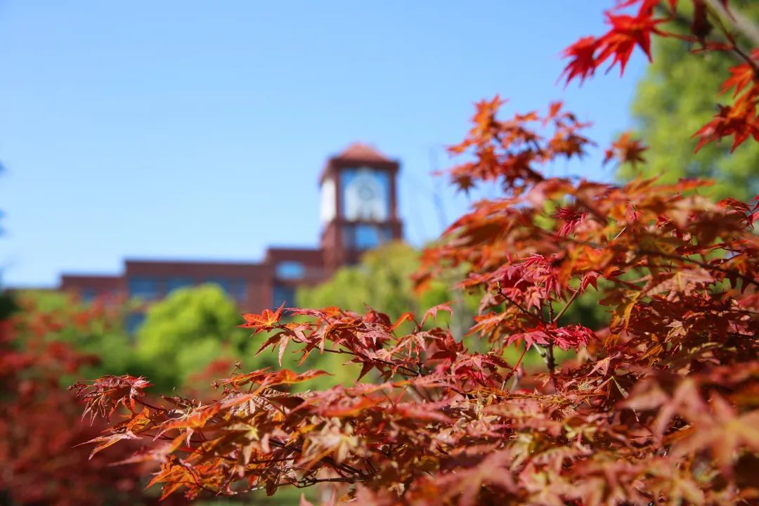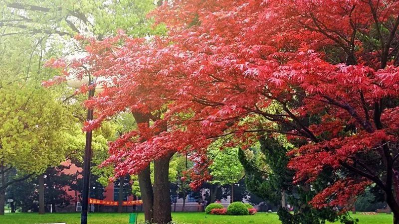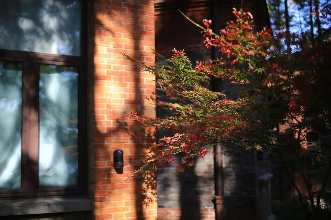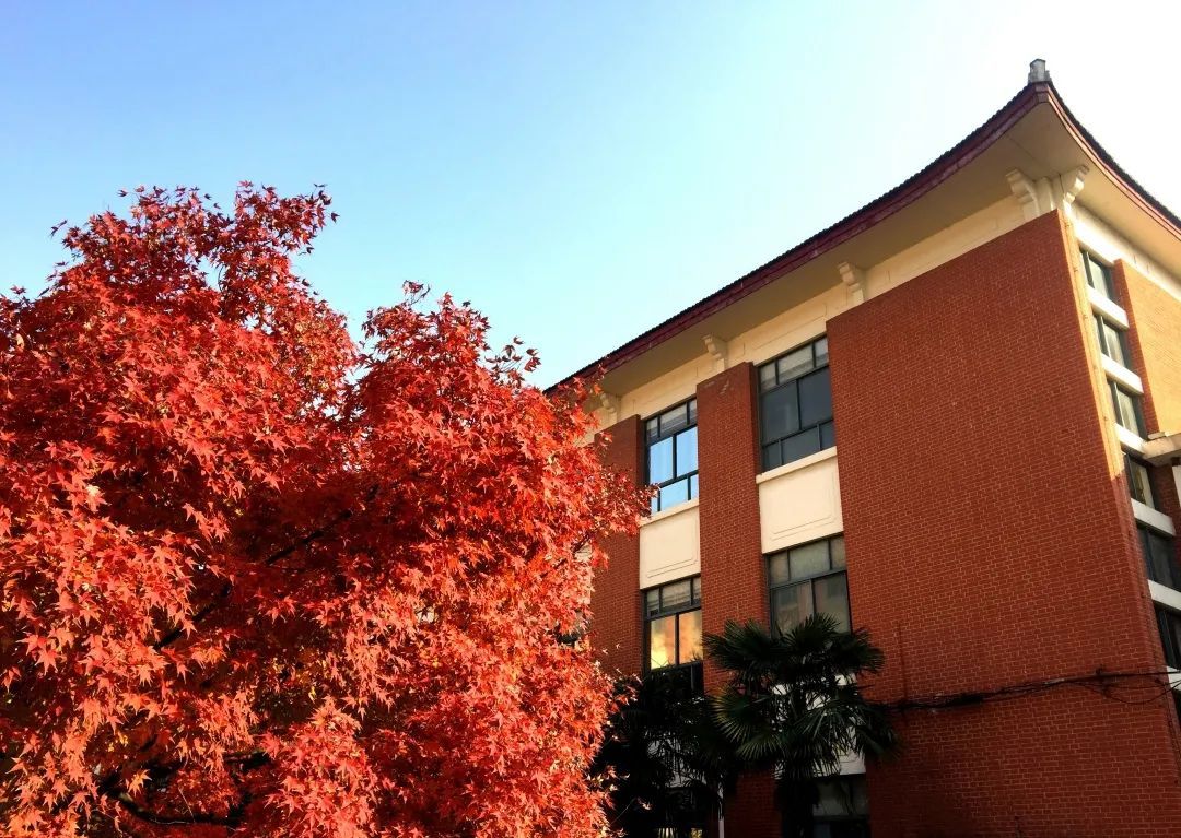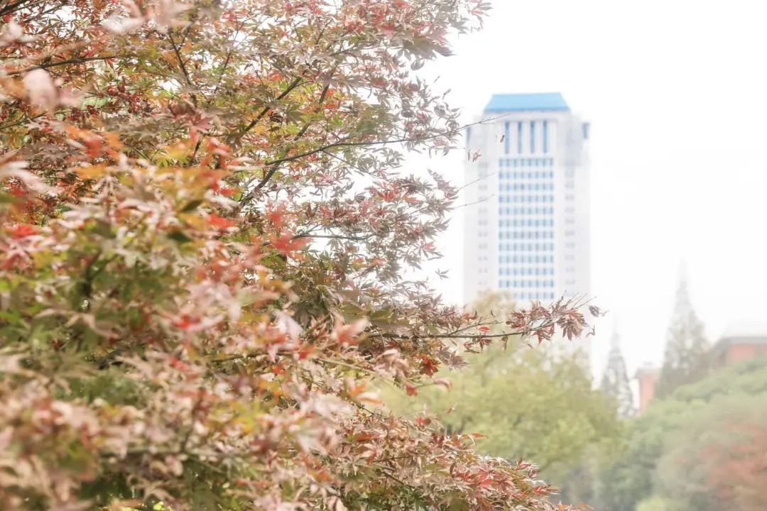 赏枫地点:长宁校区东风楼前,松江校区明法楼下。