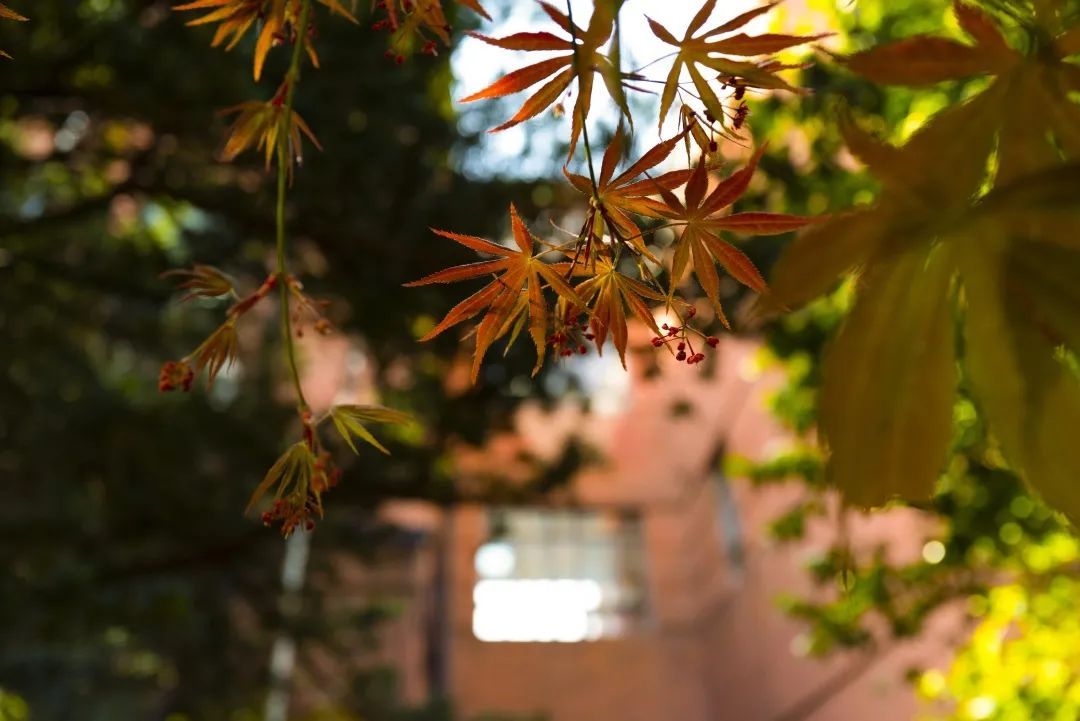 “檐下林荫光静谧,窗边客枫影婆娑。”上大园里的枫树不多,主要集中在教学楼之间,常青树木中的那抹枫色,提醒着过往师生秋意的浓烈与绚丽。
