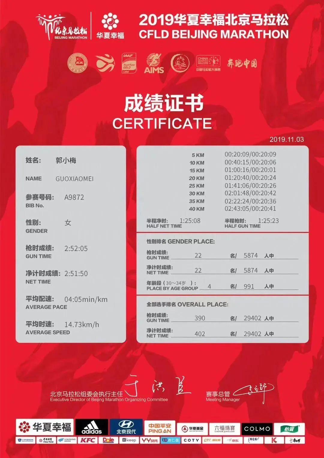 为了达到目标,我不仅每周进行专业训练营的训练,还不定期早上4点起床加练15-20公里。功夫不负有心人,我成功在2019年底的上海国际马拉松赛和北京马拉松赛事中,连续跑出3小时以内的成绩,在北马中更是实现了突破,取得了2小时51分的成绩,中国女子专业、业余全组总排名22。