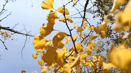 树身粗大、枝干苍劲的古银杏,小扇子一般的叶片早已披上了金黄色的风衣,在晴空之下,熠熠生辉。秋风一起,金黄色的银杏叶似蝴蝶翩翩起舞,霎时铺就一片金黄色的地毯。