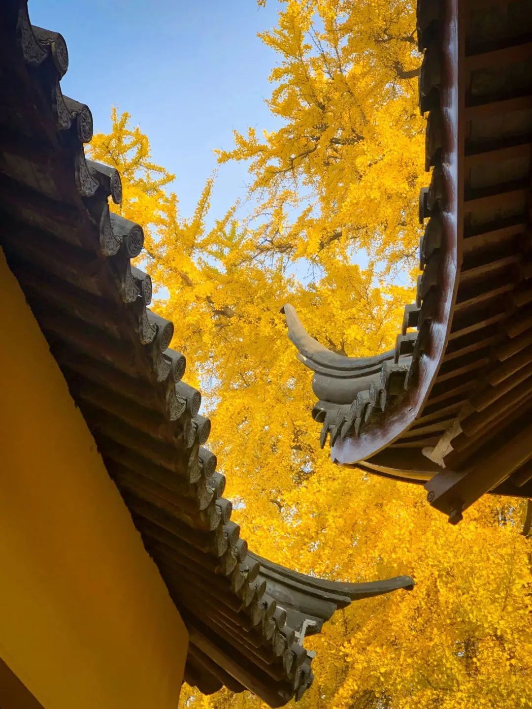 古寺秋色关不住,一地杏黄惹人怜。叶落无声秋已逝,申城尽带黄金甲。在金泽古镇的颐浩禅寺内,有一株南宋古银杏,700多年来默默地守护着千年古刹。