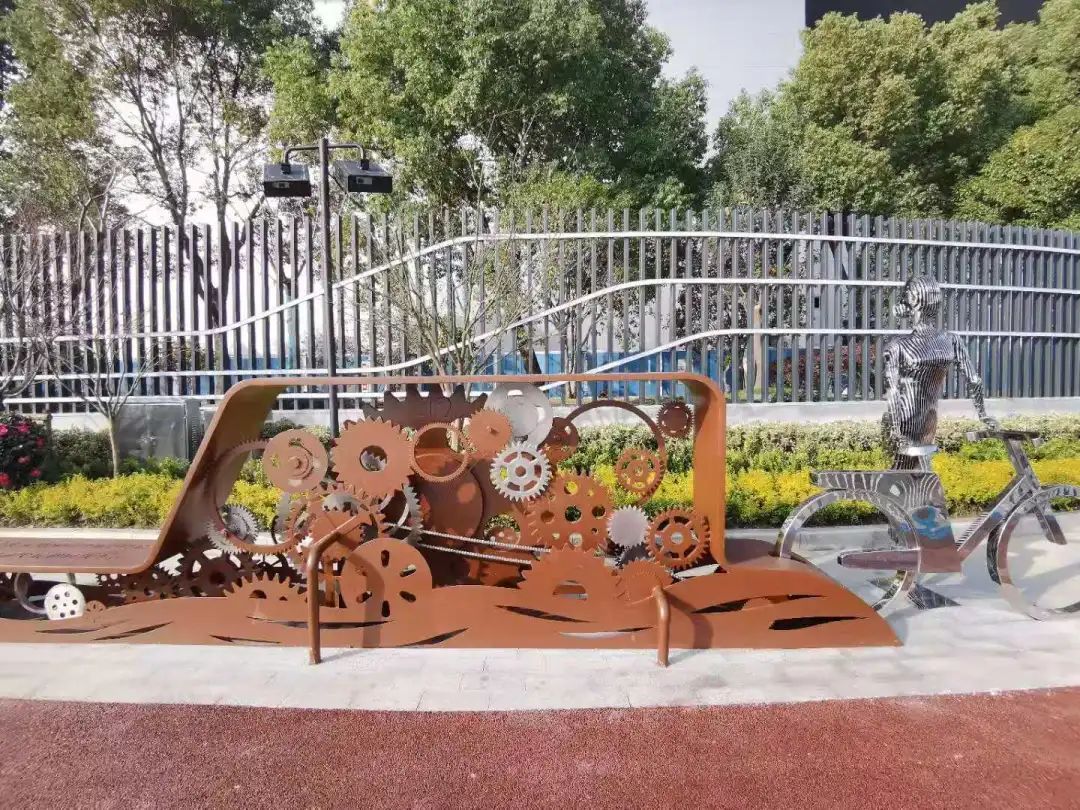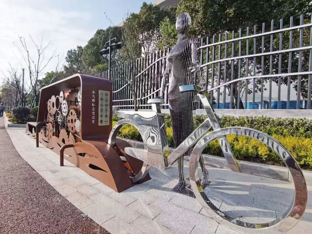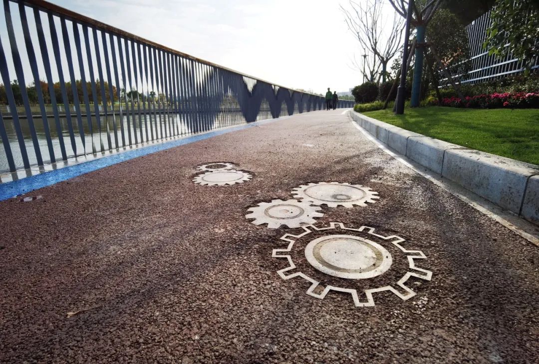 海烟物流段的步道别出心裁地加入了“齿轮”元素。据介绍,海烟物流企业代表着长宁苏州河畔现代工业的一个缩影,在步道上留下齿轮印记,包括打造“永久牌自行车”主题雕塑,都是工业概念的集中体现。