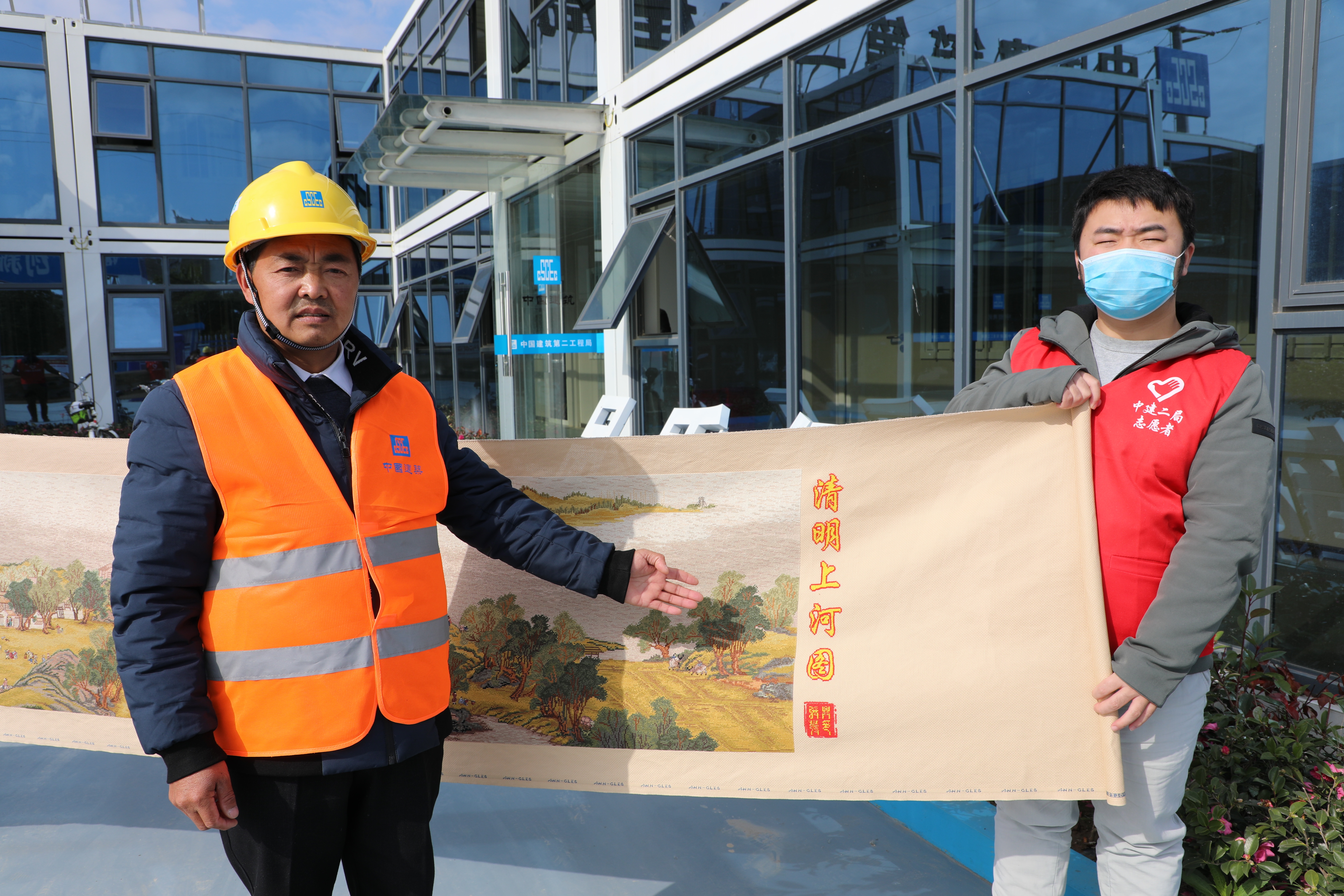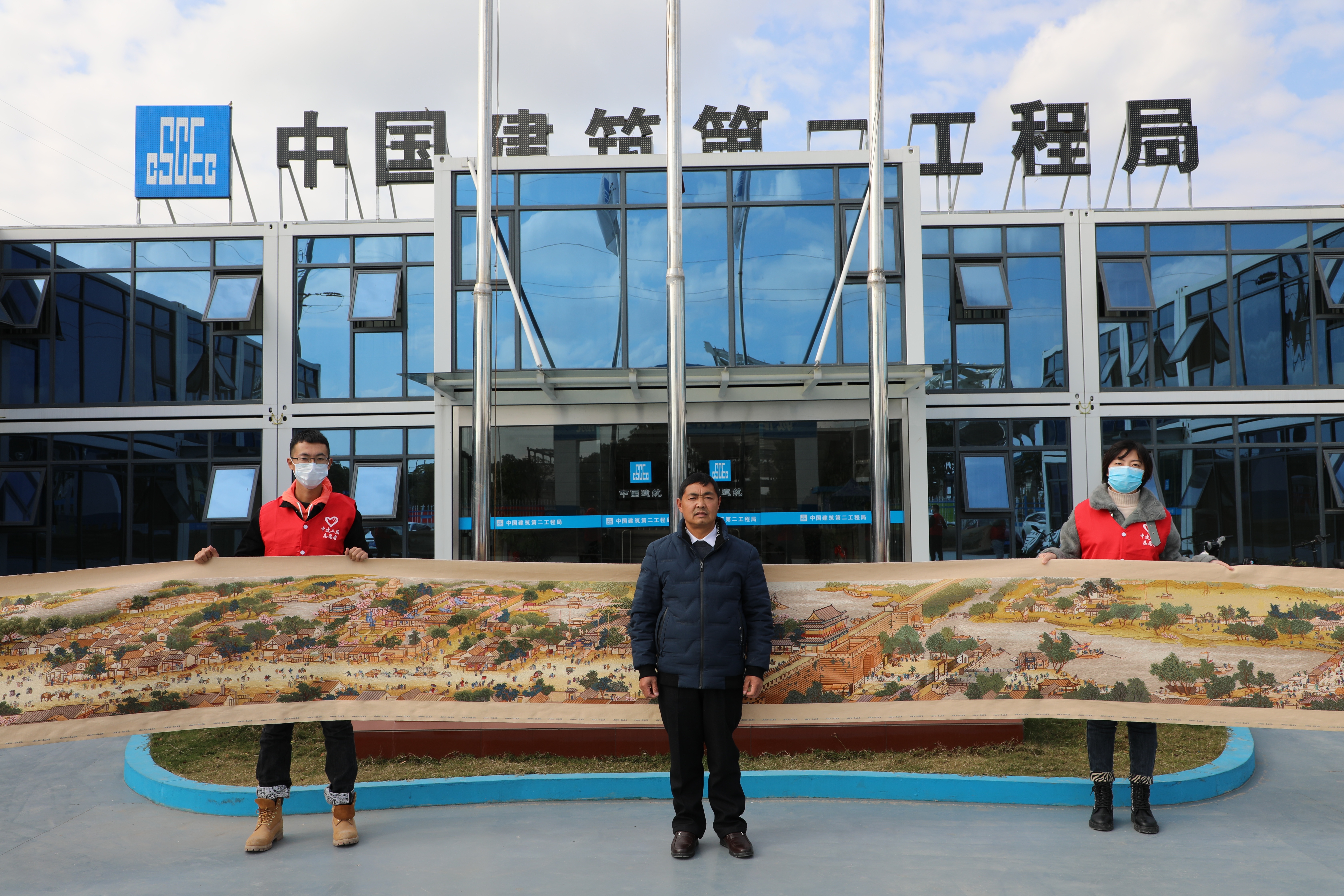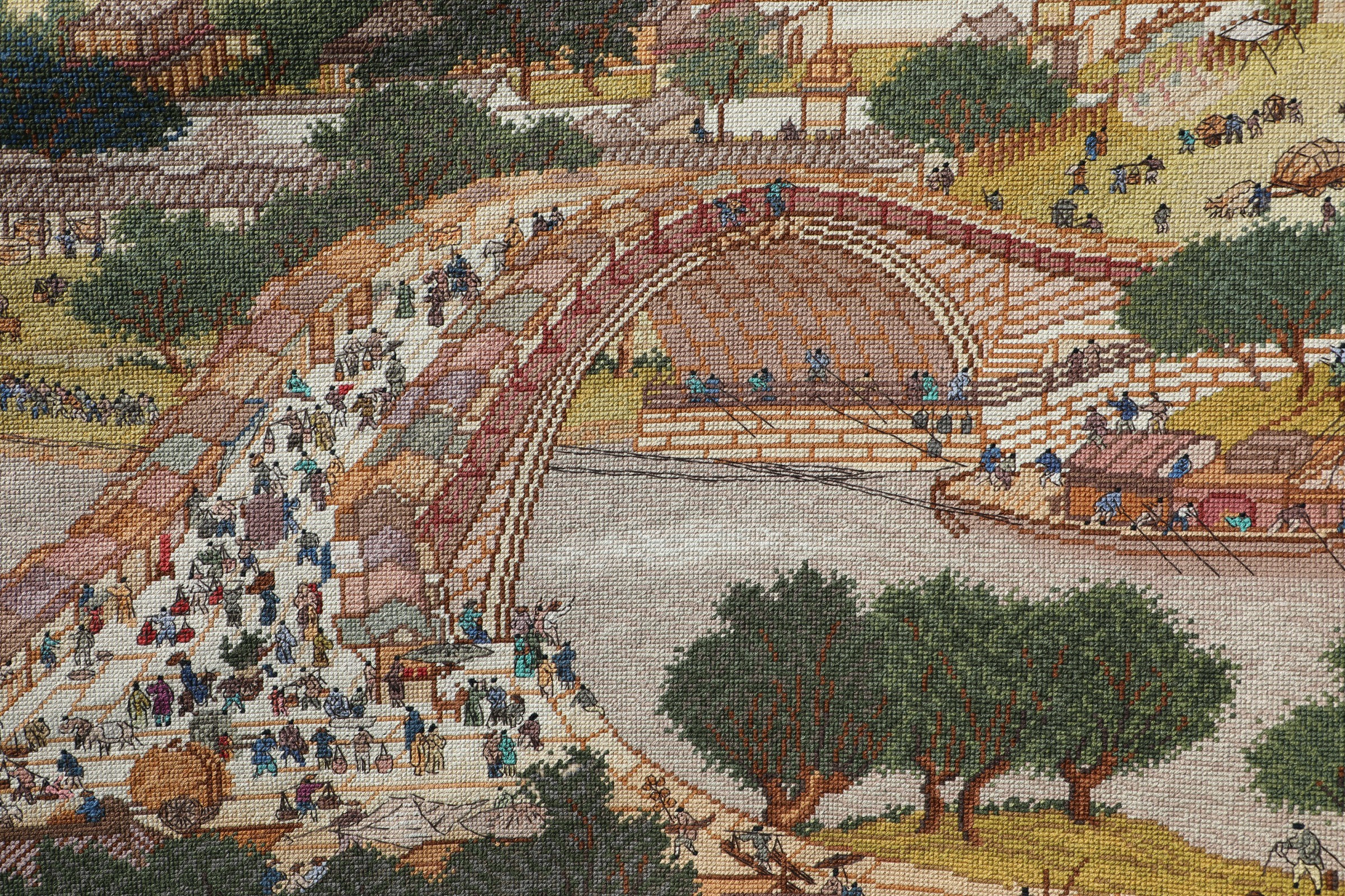 在中建二局华东公司上海奉贤中电建项目门前广场上,7名建筑工人合力展开了这幅绣有1643个人物,全长22米的清明上河图十字绣。作品上,不论是树林稻田,石桥船只,还是亭台楼阁,都被一针针绣了出来。然而这幅十字绣的作者并不是十指纤纤心细如发的女子,而是一位头戴安全帽手握电焊枪的电焊工人——张兴发。对于老张来说,十字绣作品清明上河图的完成,是他人生中一件特别重要的事情,也收获了周围人的认可。