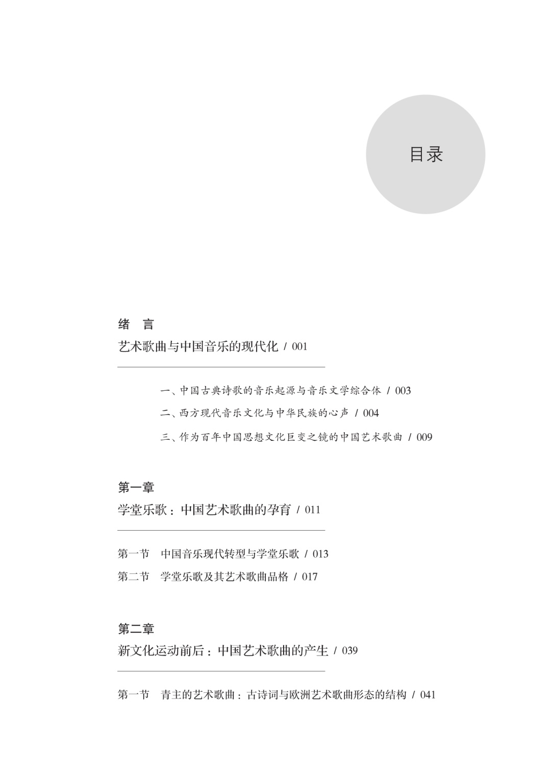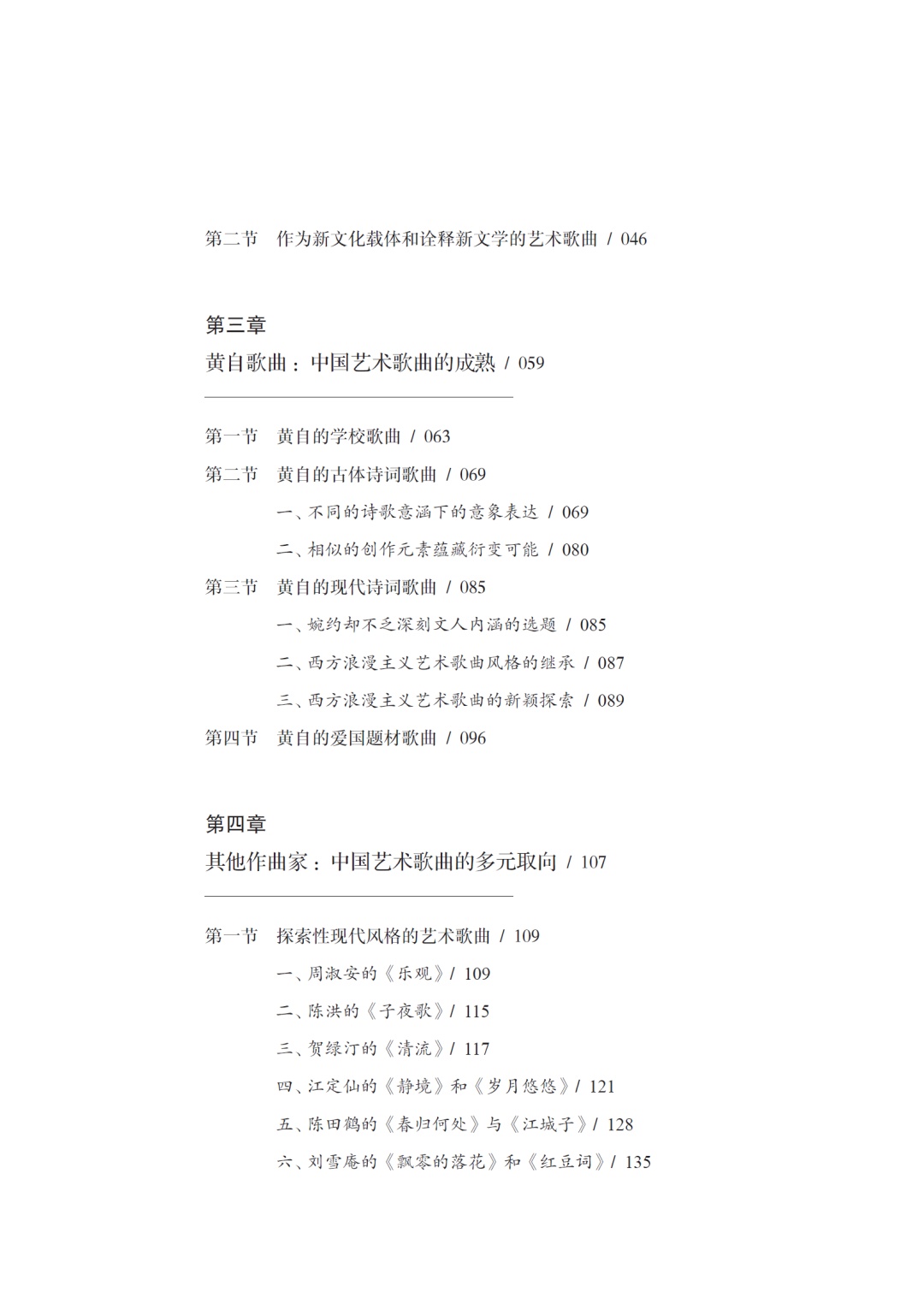 中国艺术歌曲自20世纪诞生以来影响深远,它既是曾经中国社会新思想的载体,也是如今声乐教学实践中的重要素材。无论是从音乐史学角度还是音乐表演领域来看,中国艺术歌曲都是值得深入研究探讨的一种体裁。本书论述的对象为20世纪前半叶的中国艺术歌曲。全书由绪言、结语和作为主体的四章构成。每一章对应早期中国艺术歌曲发展中的一个特定历史阶段,在具体写作方法上,每一个时期都由历史文化背景及音乐史语境、主要艺术歌曲作品的风格技法与形态分析、对作品的表演诠释等三个部分构成。