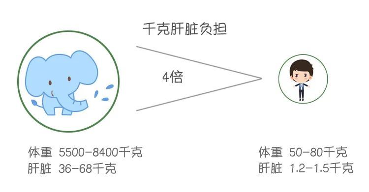 另外,大象的毒物代谢能力也相对脆弱。非洲象体重5.5-8吨,肝脏质量约36-68千克,每千克肝脏负担80-220千克(平均约150千克)体重的有毒物质代谢。相比较,人类体重50-80千克,肝脏重量大概在1.2-1.5千克,每千克肝脏负担30-50千克(平均约40千克)体重有毒物质的代谢。因此大象肝脏承担了约4倍于人体的解毒负担。