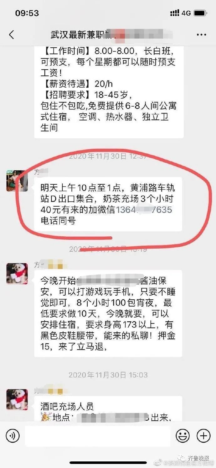 “奶茶店充场3小时40元工费”的群聊截图。