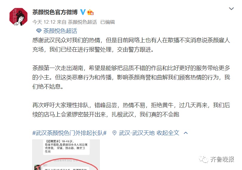 茶颜悦色官方微博进行了回应: