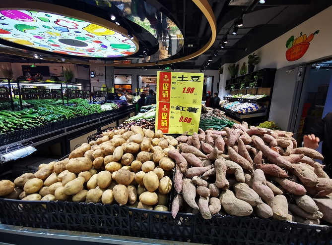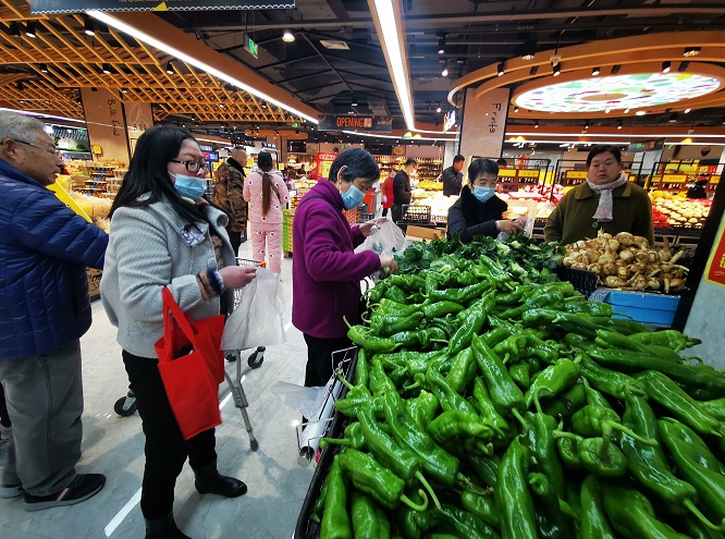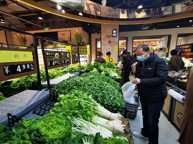 来到超市,正逢早市时间,前来购物的市民陆续进入,蔬果区、鲜肉区、水产区、面点区尤其受市民青睐。